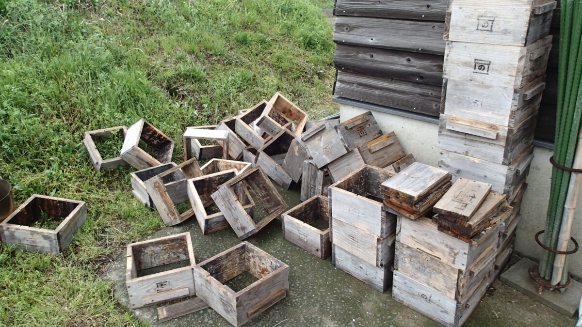 長く使った巣箱を処分するために作業場の軒下に積み上げていたら、強風で崩れて転がっていました。