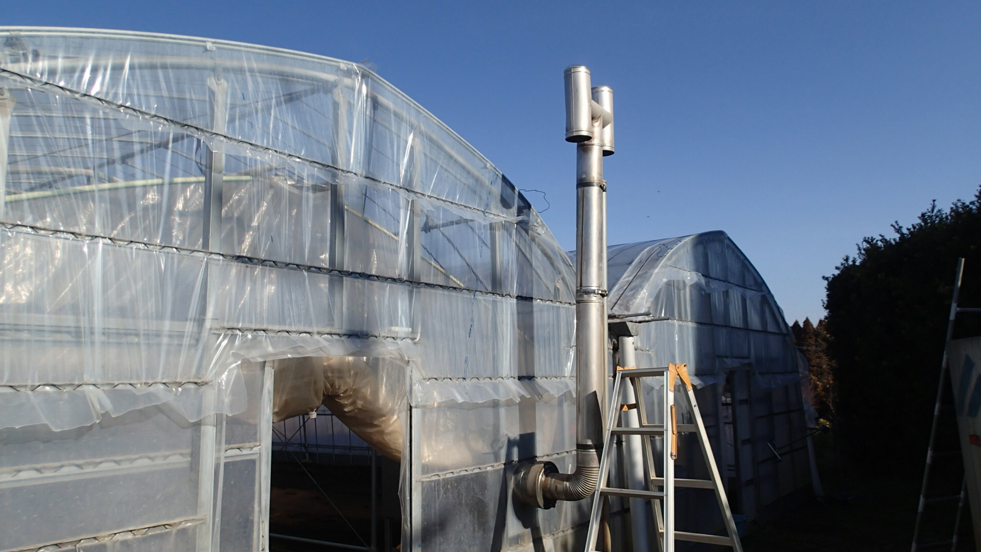 小さいハウスで温度が低いならロケットストーブでも良いかも、ただ薪の補充をどうするかだと思います。