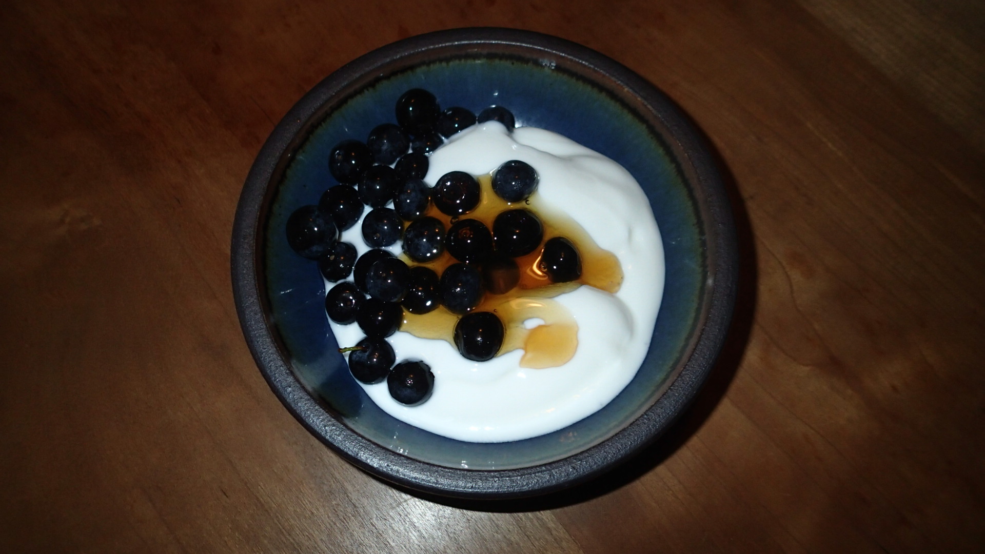 ヨーグルトにブルーベリーをのせて、それに今年初めて採れたはちみつをかけます。