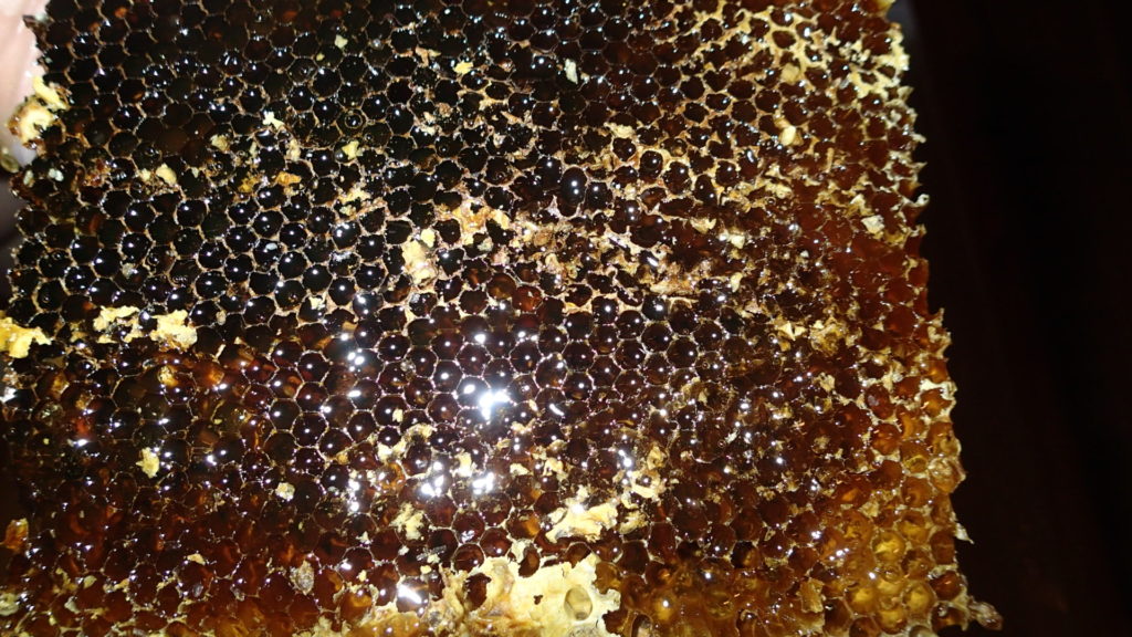 現場から切り取って来た継箱にはみつばち達が集めてきたたくさんのはちみつが詰まっています。
