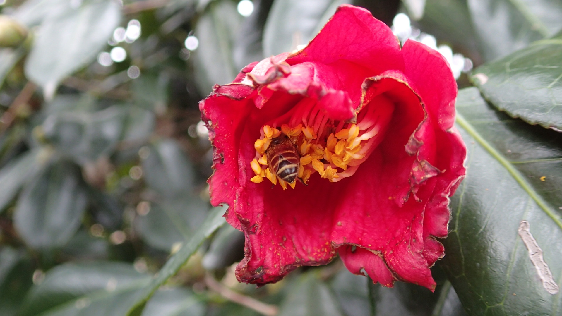 家のまわりに椿が植えてあって、みつばちがたくさんきています。
