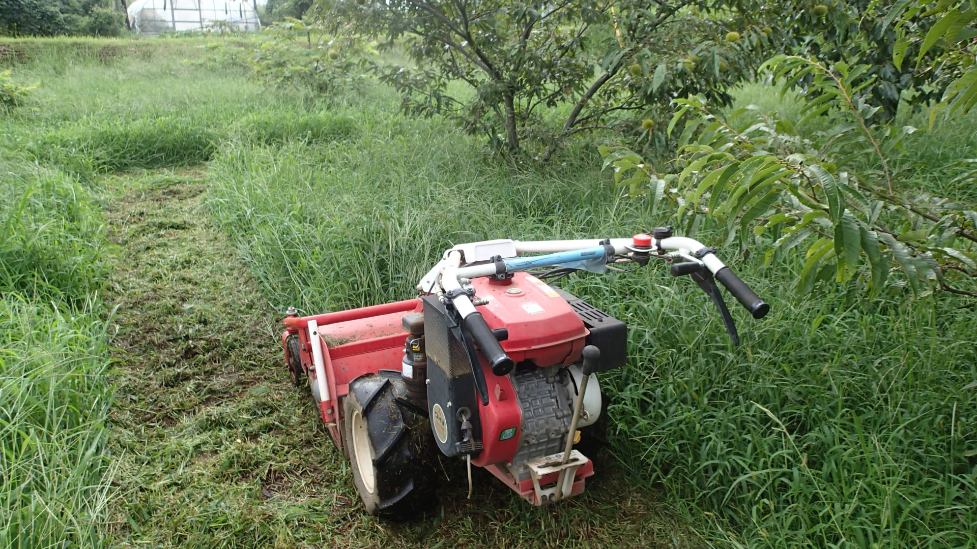 それと今日の仕事はもうひとつ、果樹園の草が伸びて、栗が落ちるまえになんとかしてと家内に頼まれていたので、部分的にハンマーモアをかけました。天気が悪いので全体をハンマーモアかけるのは、天気が落ち着いてからです。