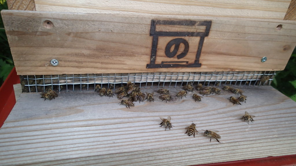 アカバチが来ています。みつばちが巣門のところで羽をブルブルさせていました。