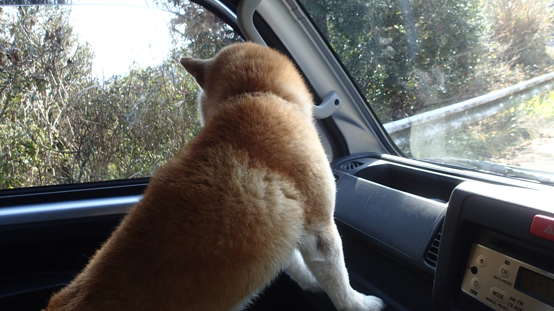 移り変わる景色が好きなのか、普段目にしない景色がめずらしいのか、前足をフロントに置いて、前だけをじっと見ている時もあれば、過ぎ去る景色を追いかけるように振り返り、「今のはなんだっただろう?」って感じで見ています。