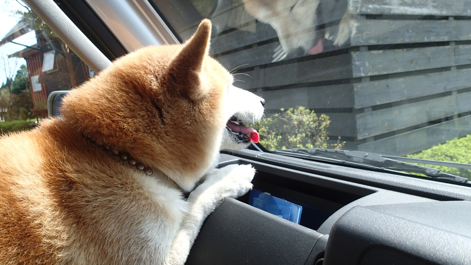 タローもいっしょ、車がかわったので足の載せばに困っているようです。