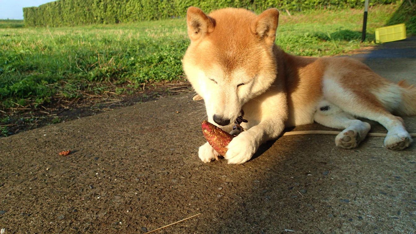 近所のおばあさんが、里芋とサツマイモを持ってきてくれました。留守番していた犬には小さなサツマイモをくれました。犬は焼き芋も食べますが、生でも平気、”ガジガジ”して遊びます。