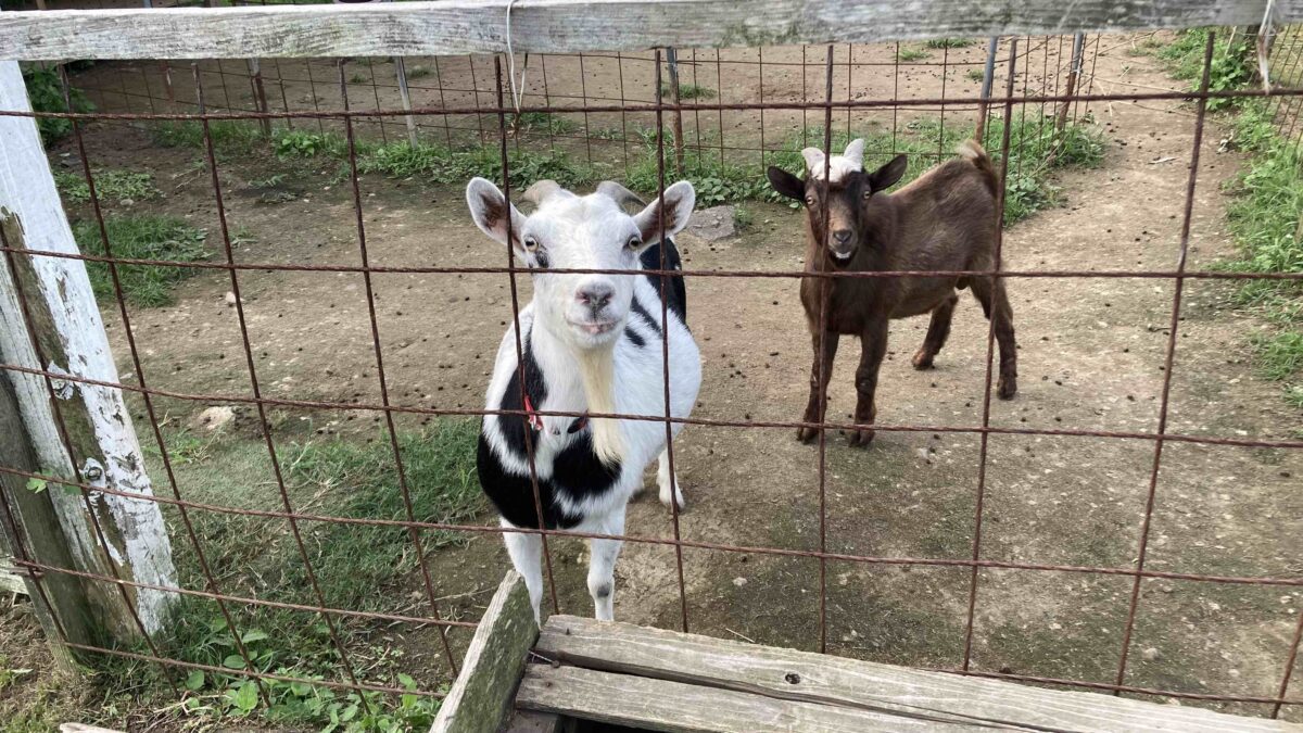 うんちの途中、最近はさほど興味がありませんが、ヤギが飼われているところでヤギ三匹に出逢います。
