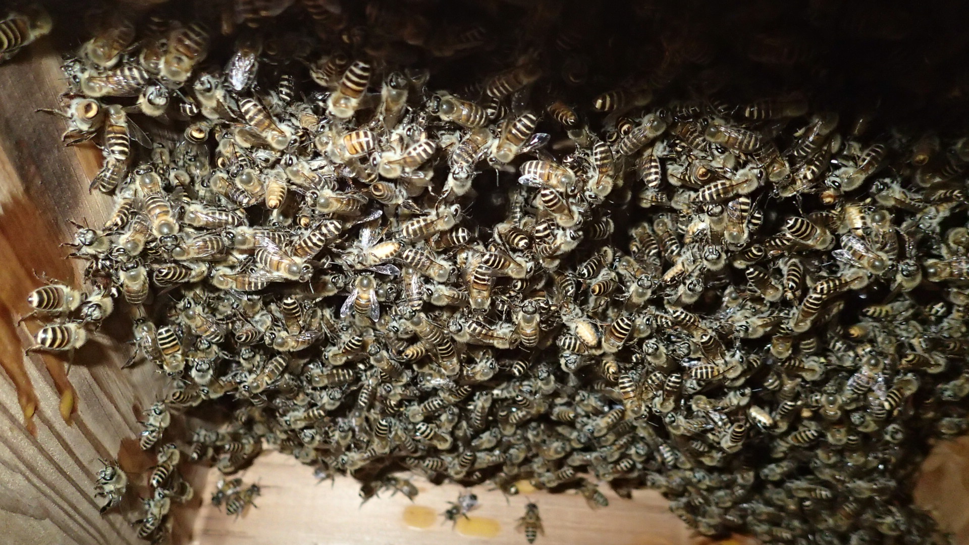 2段採蜜してはち達はどこまできているのか内検したら、今回新たに追加した継箱の巣落ち防止棒は見えません。
