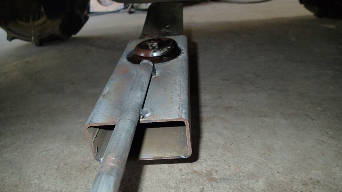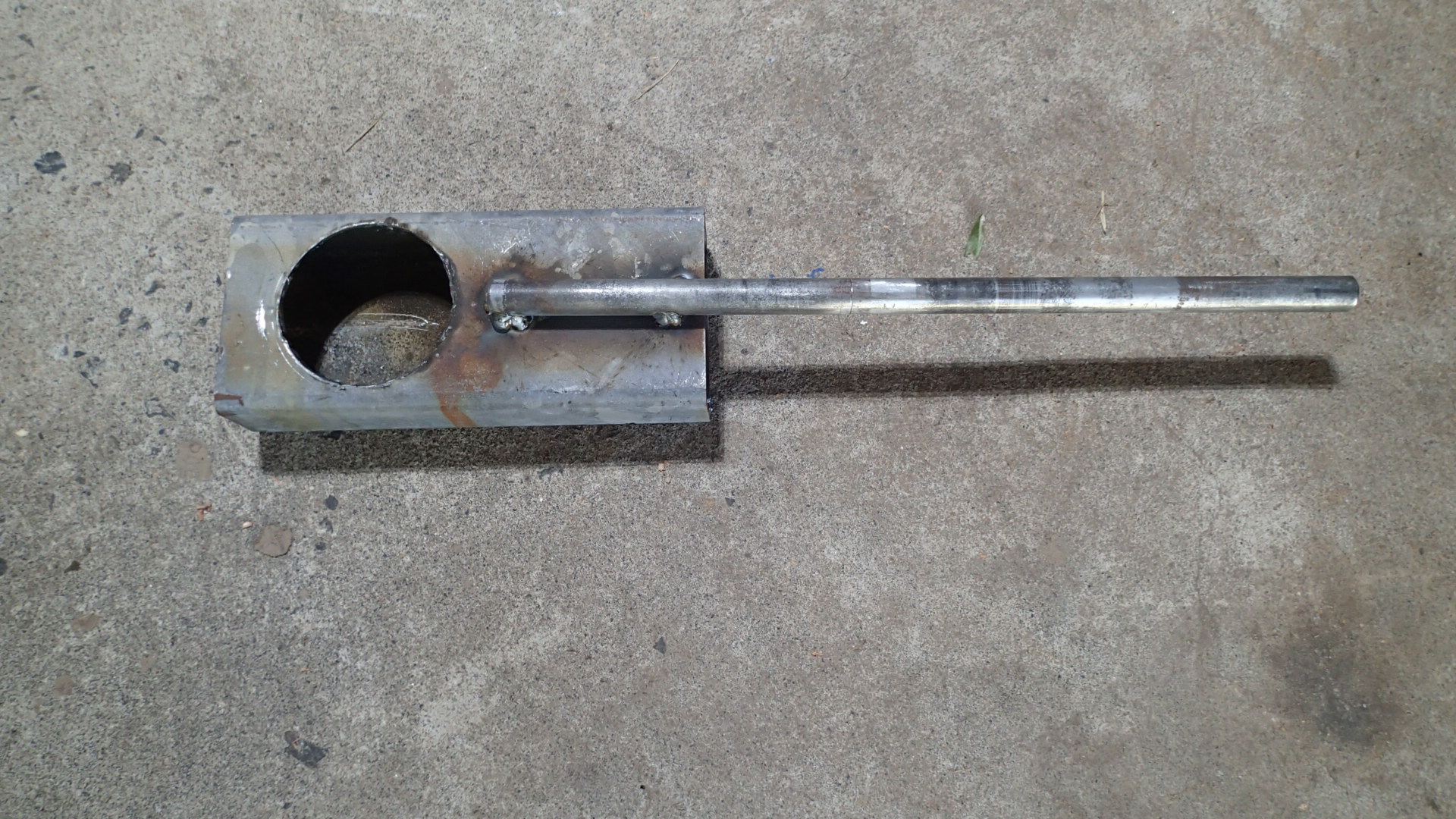 長四角パイプの切れ端があったので、それの端をプラズマカッターで丸く穴開けて、丸棒を溶接して専用の取り外し治具を作りました。