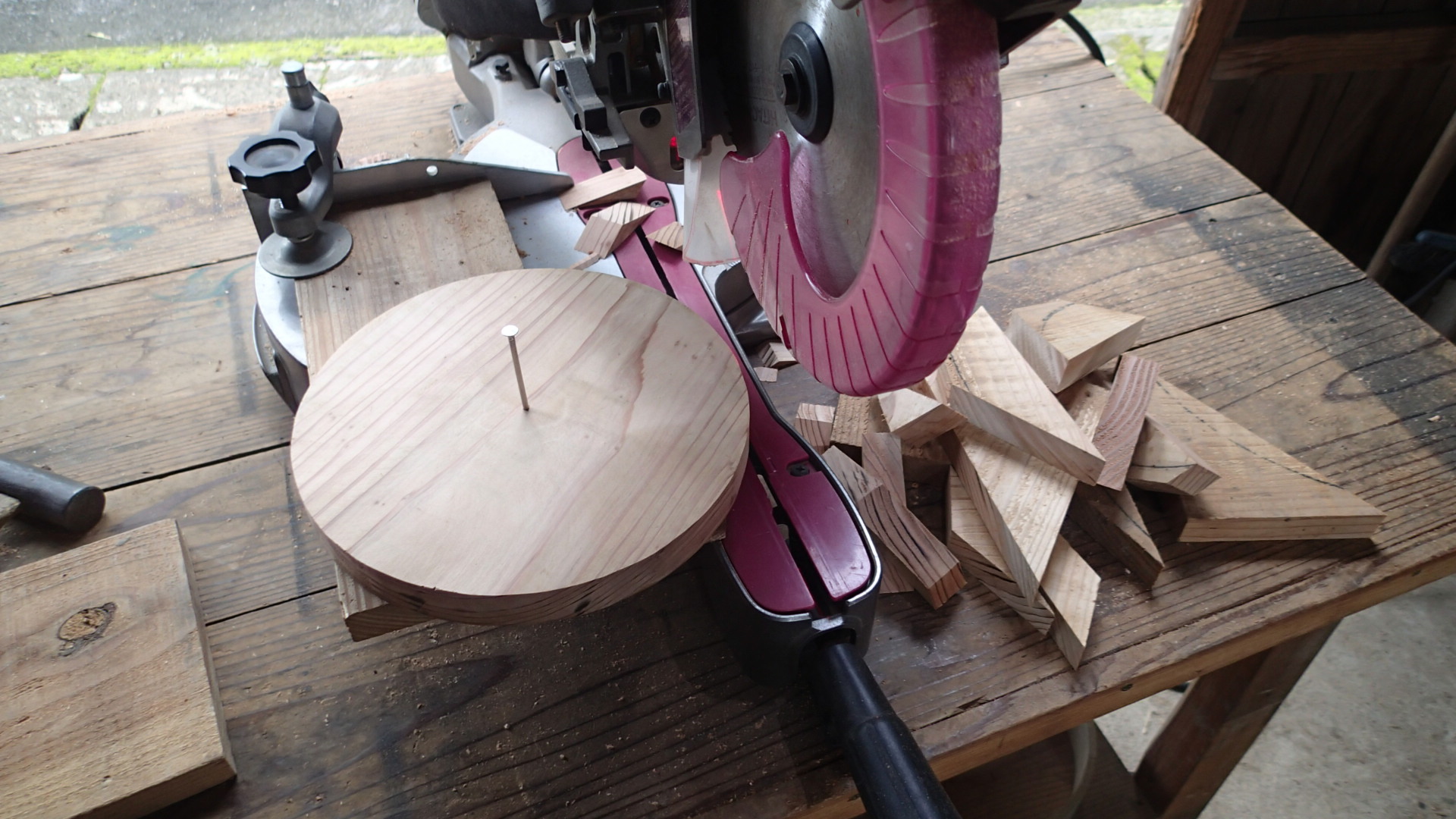 まずは、丸い板を作ること、前回はジグソーで丸くしました。