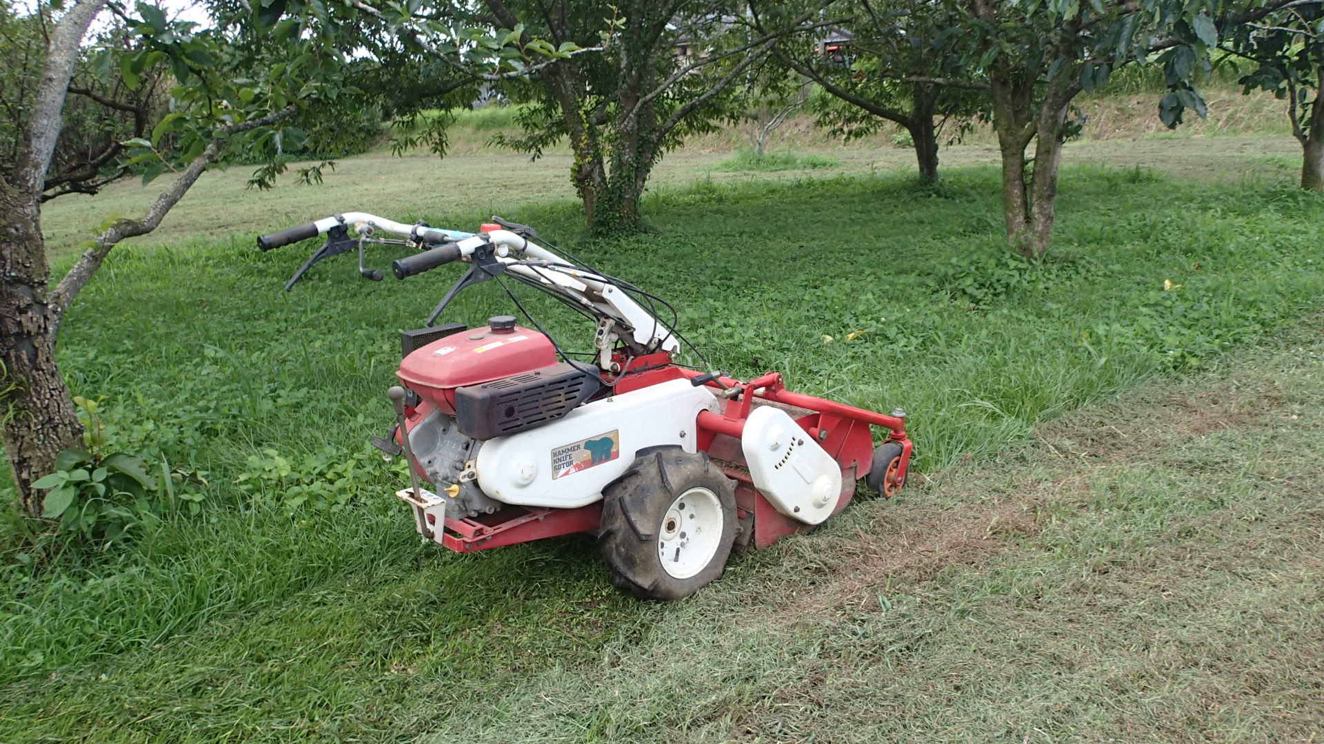 ただ、我が家の果樹園全部を自走式でやったわけではなくて、トラクターに取り付けるハンマーモアも活躍しました。本来ならば、フレールモア(家内が乗って草を刈る芝刈り機に近いやつ)でやれば早いけど、イノシシが掘ったくっていて、刃がいたんでしまうので、昨日はすべてハンマーモアで片付けました。