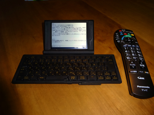 食事の前のほんの5分で思いついたことをメモ書きできます。電源オフも簡単。なにせ小さいですから、キーボードも折りたたみときています。更にテキストファイルでセーブしてくれますから、パソコンへの読み込みも簡単。