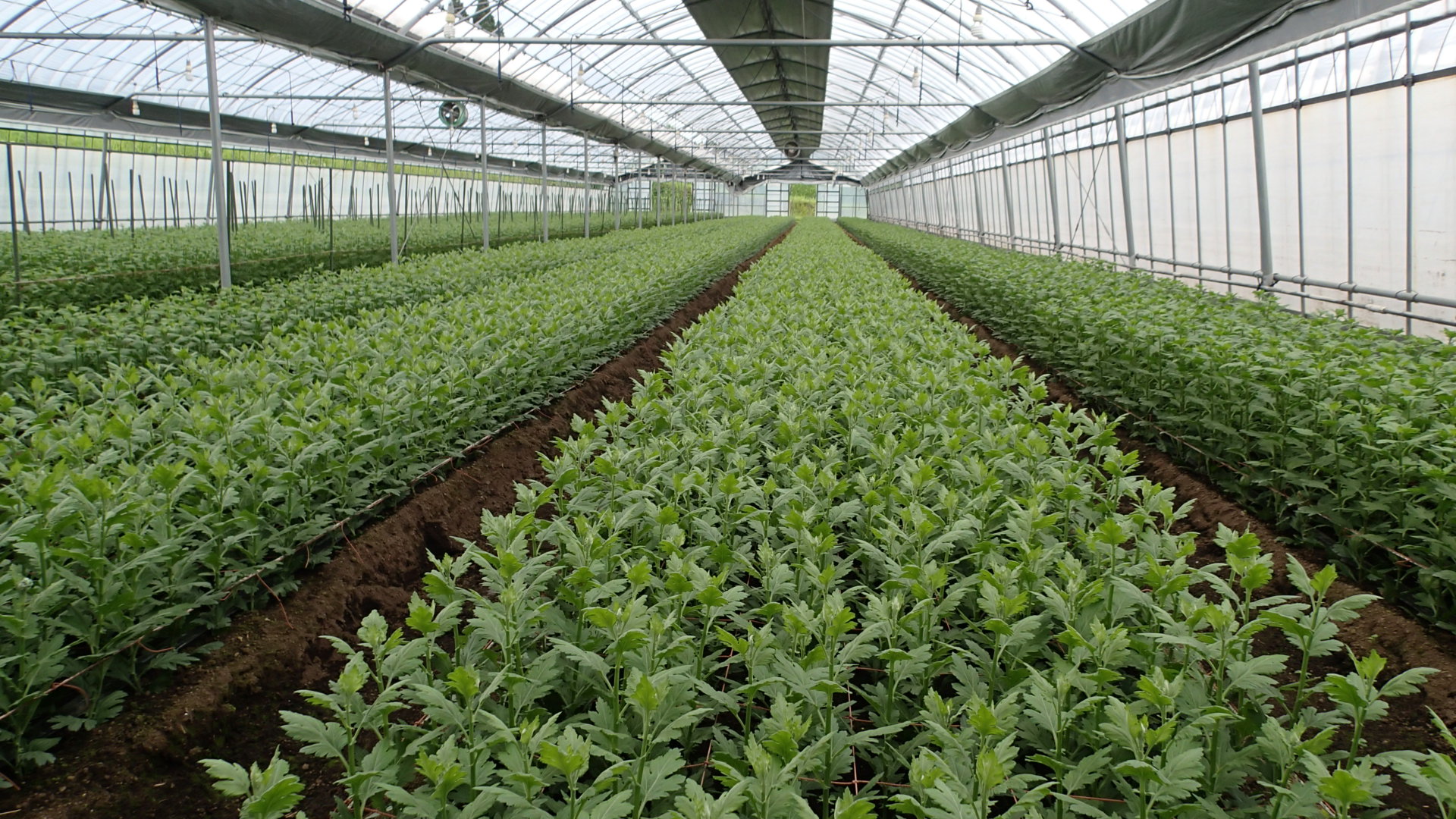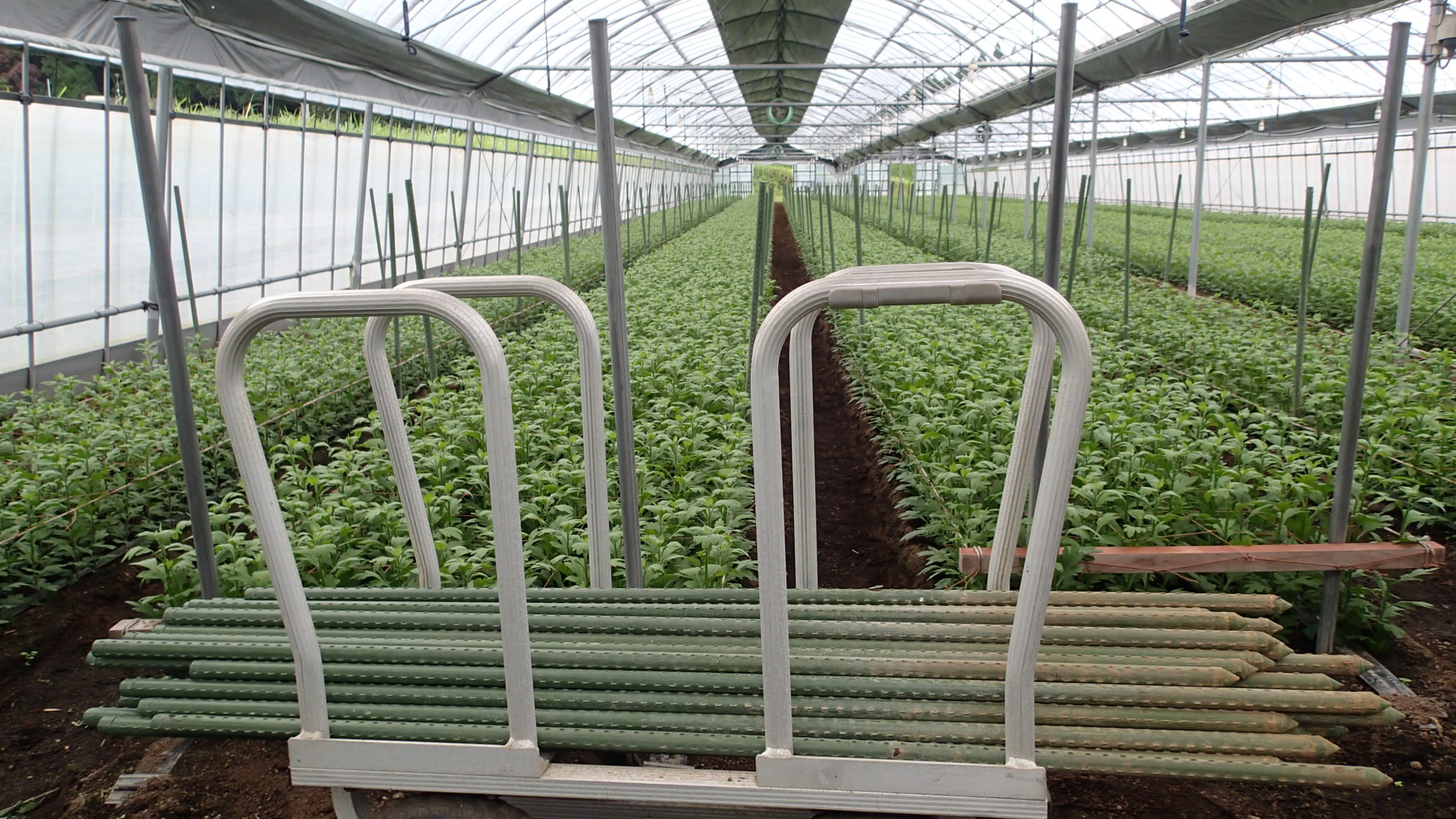 キクの成長に合わせてフラワーネットを高くするための支え棒をたてました。