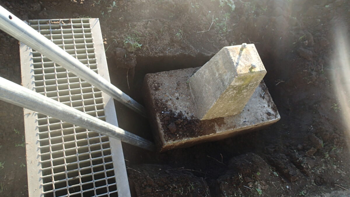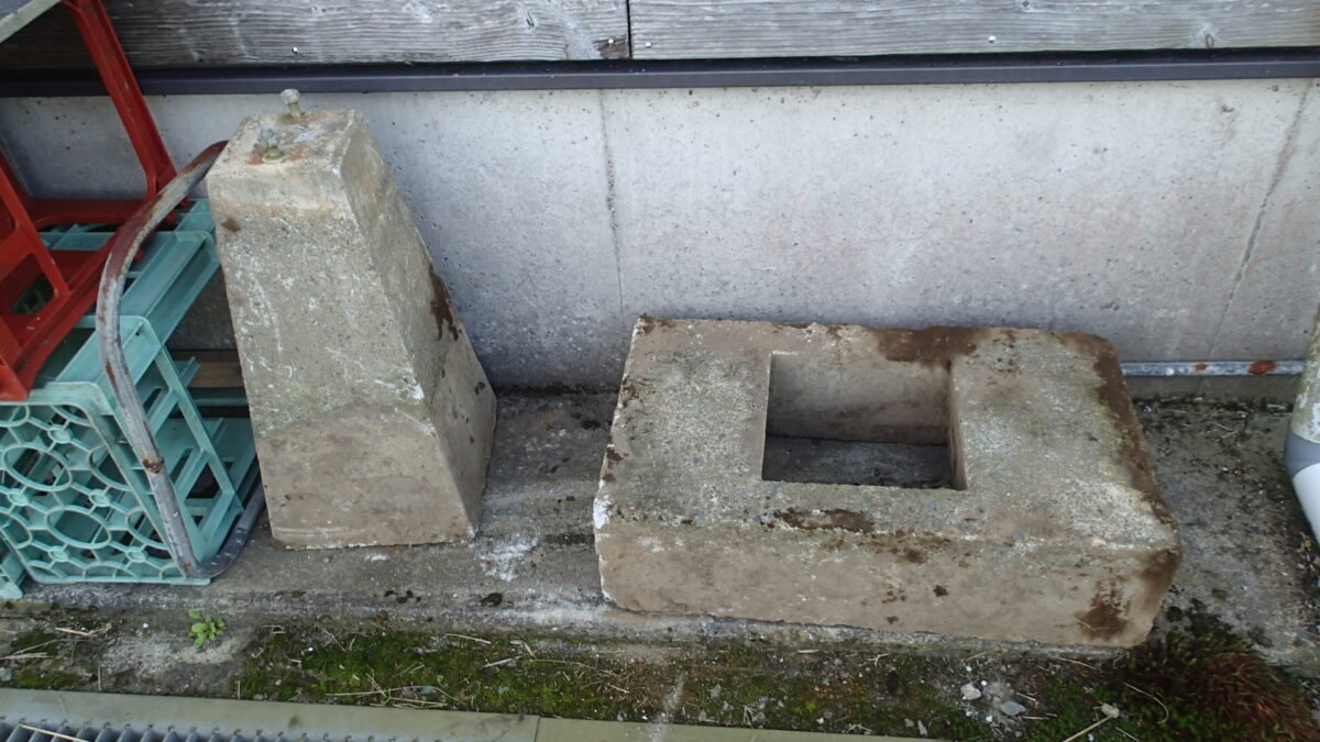 ハウスの基礎石、作業場の前に設置して鉄筋工作の治具固定に使っていました。