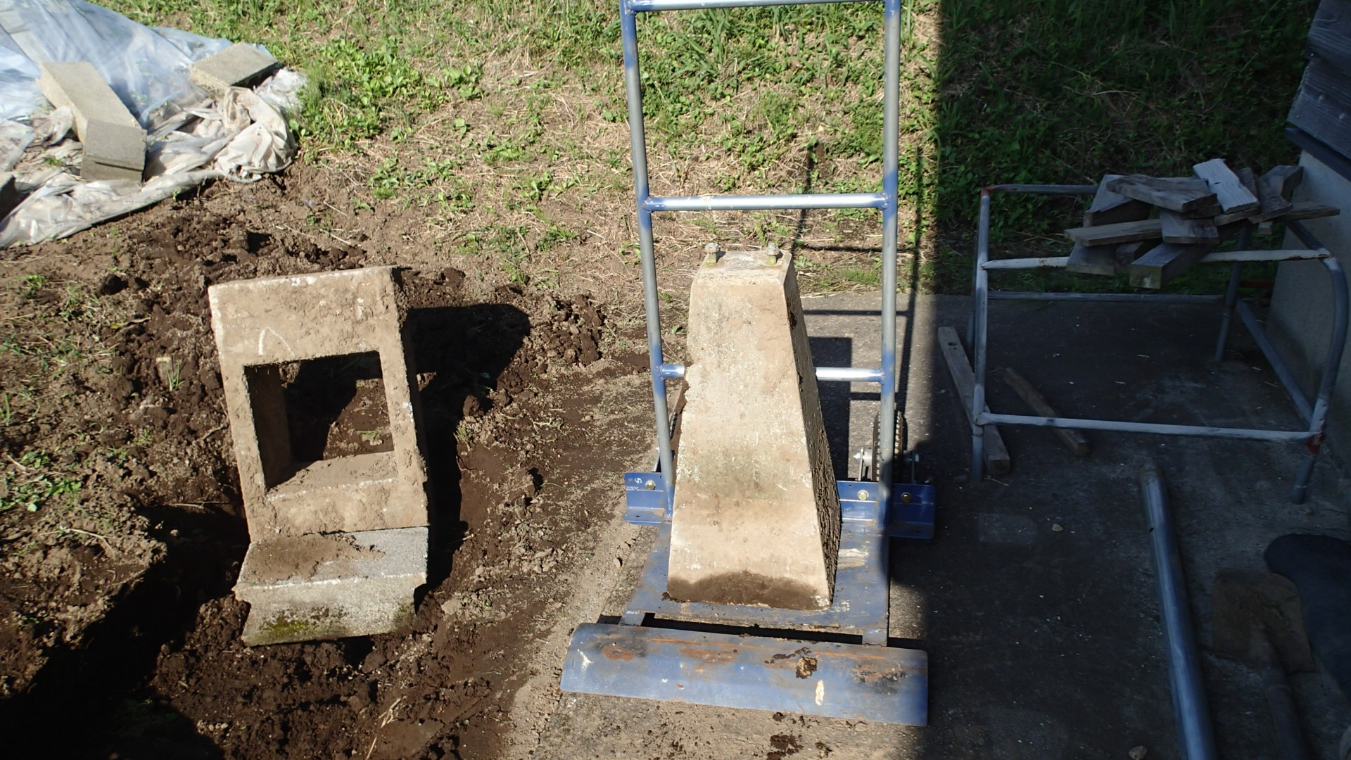 そして移動は手作りの運搬台車、基礎石なんか運ぶつもりで作ったわけではないけど、やってみたら結構いけました。