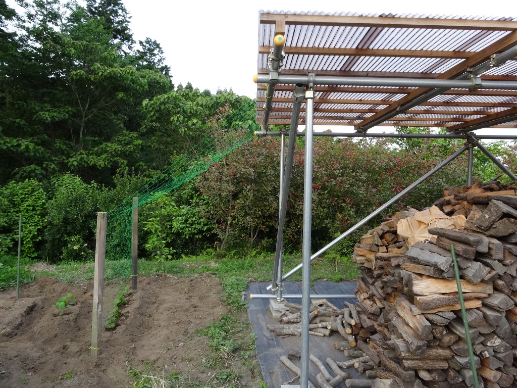 家内が”ニガウリ”を植えてネットを薪小屋に結んで、
