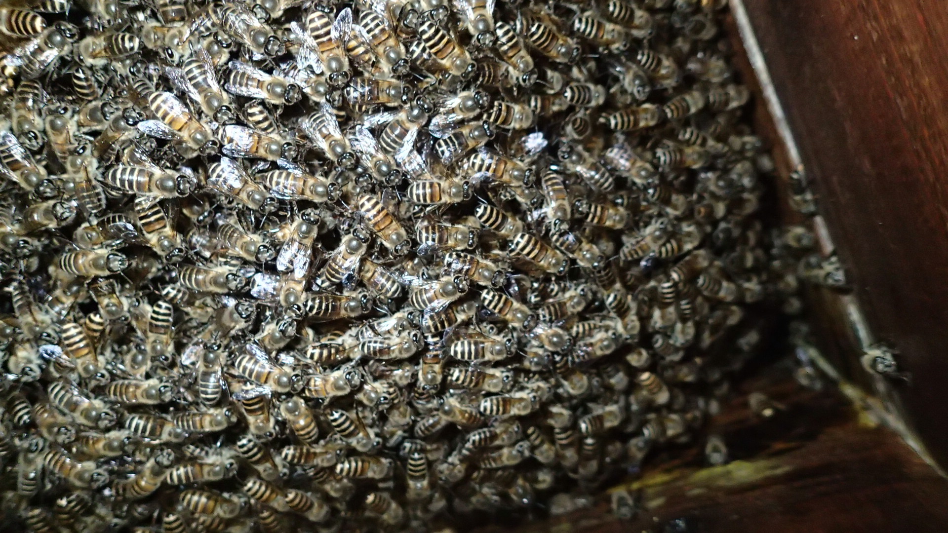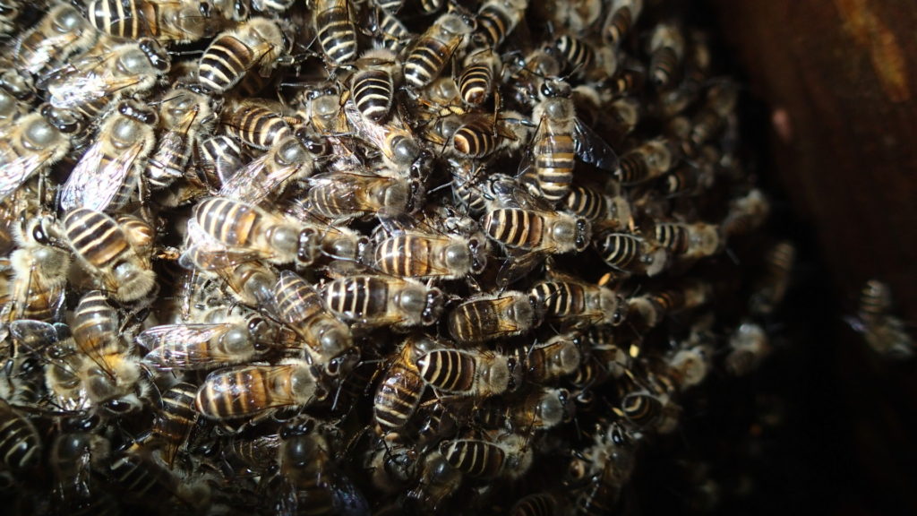 そしてもう一群は雄蜂の巣蓋もたくさん出ていて、こちらは分蜂するでしょう。待ち箱は2個設置しました。
