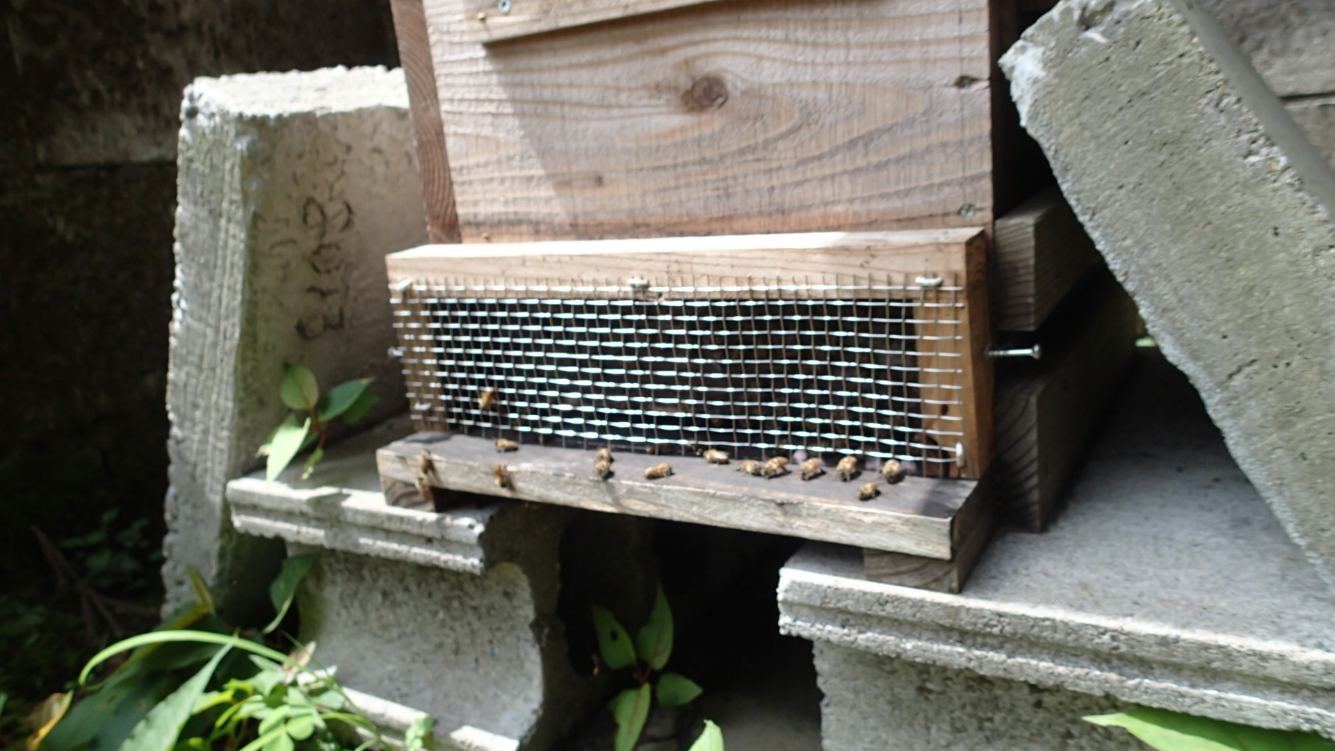 蜂箱台がブロックで巣門から底の金網まで障害物がない蜂箱。