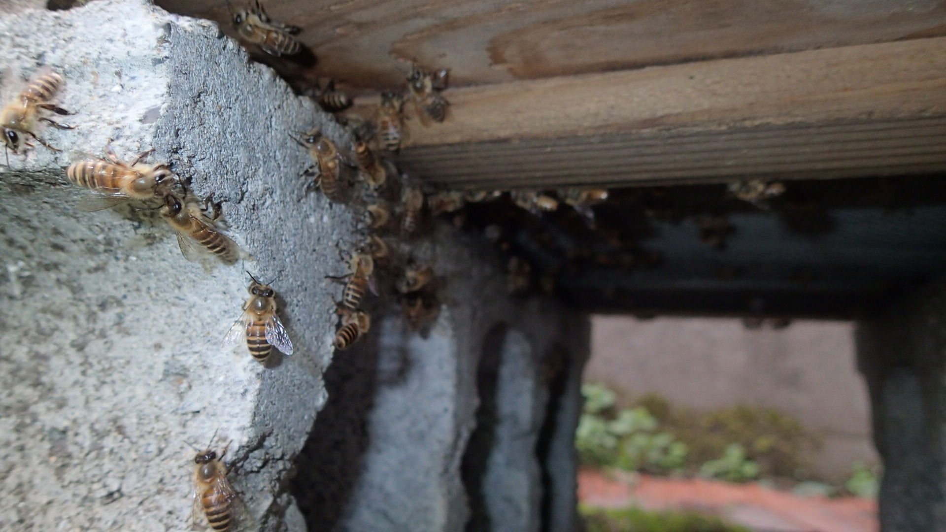 花粉を足いっぱいに付けたみつばちが上がってゆく様は、そこに道があるかのように巣門の隅を通って中に入ってゆきます。