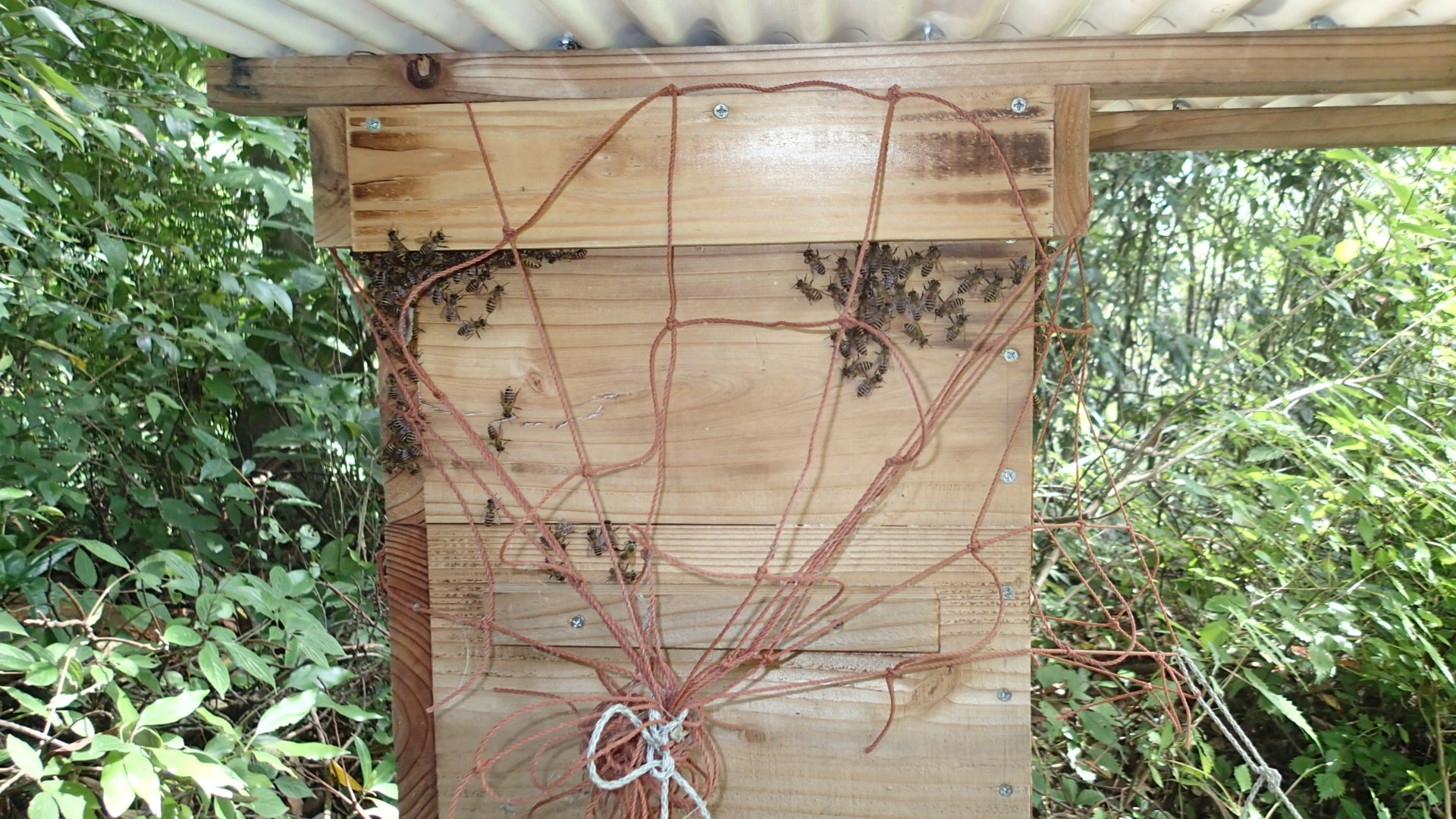 巣箱の外にみつばちがいつも張り付いています。