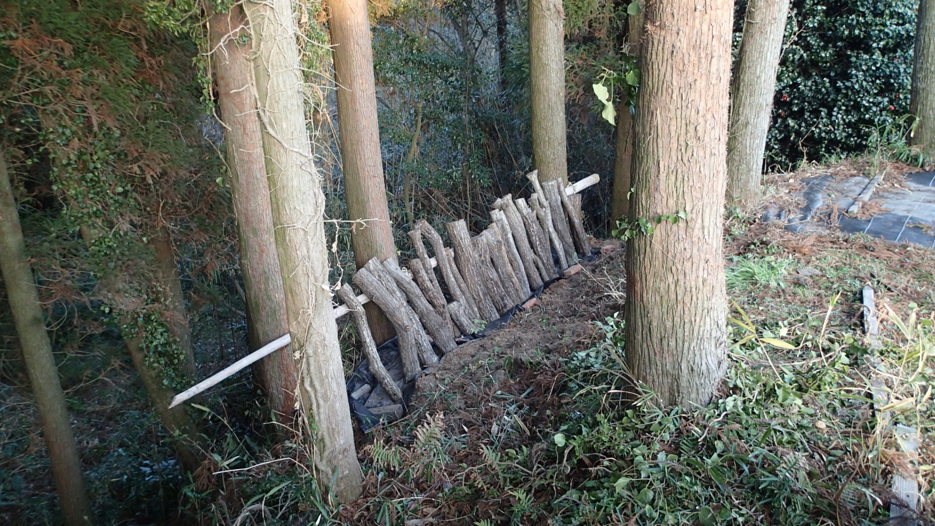 久しぶりの晴れ模様、ほぼ一年間ねかせてあった、きのこのほだ木を陽があまり当たらない場所にたてかけました。