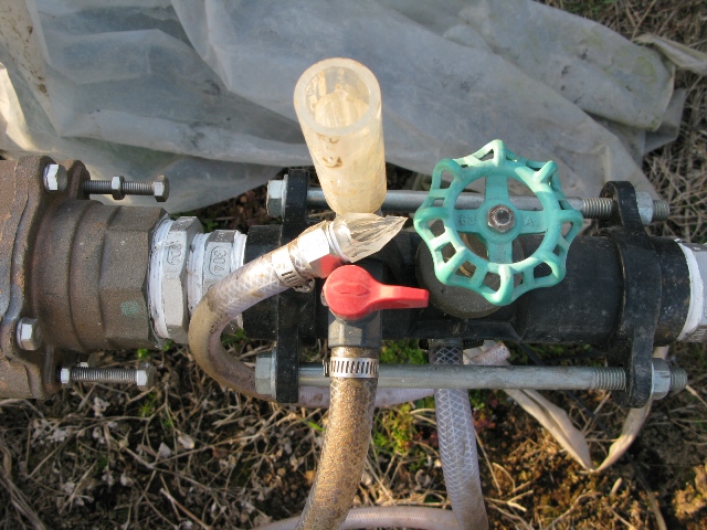 天気が続いたのでちょっと早めの灌水、畑灌の元栓を開けたらカバー内から突然水が噴出してきた、こんな時色んなことが頭をかけめぐるがフィルターなどの水抜きはしてあるから凍結で破裂はないだろうと思い、カバーを取ったら液肥混入器の液肥の投入量を見れるゲージ部分が破裂していた。ここの水抜きはしてなかったと後悔です。[ まっ!たいして役に立ってもいないな]と思っていたので直結でチューブを取り付け修理完了。風がなくドアを開けていても冷たい空気が吹き込むこともなく灌水できた。前回は強風の中でのホースの引き回しだったのでキクには寒かろうと思った。