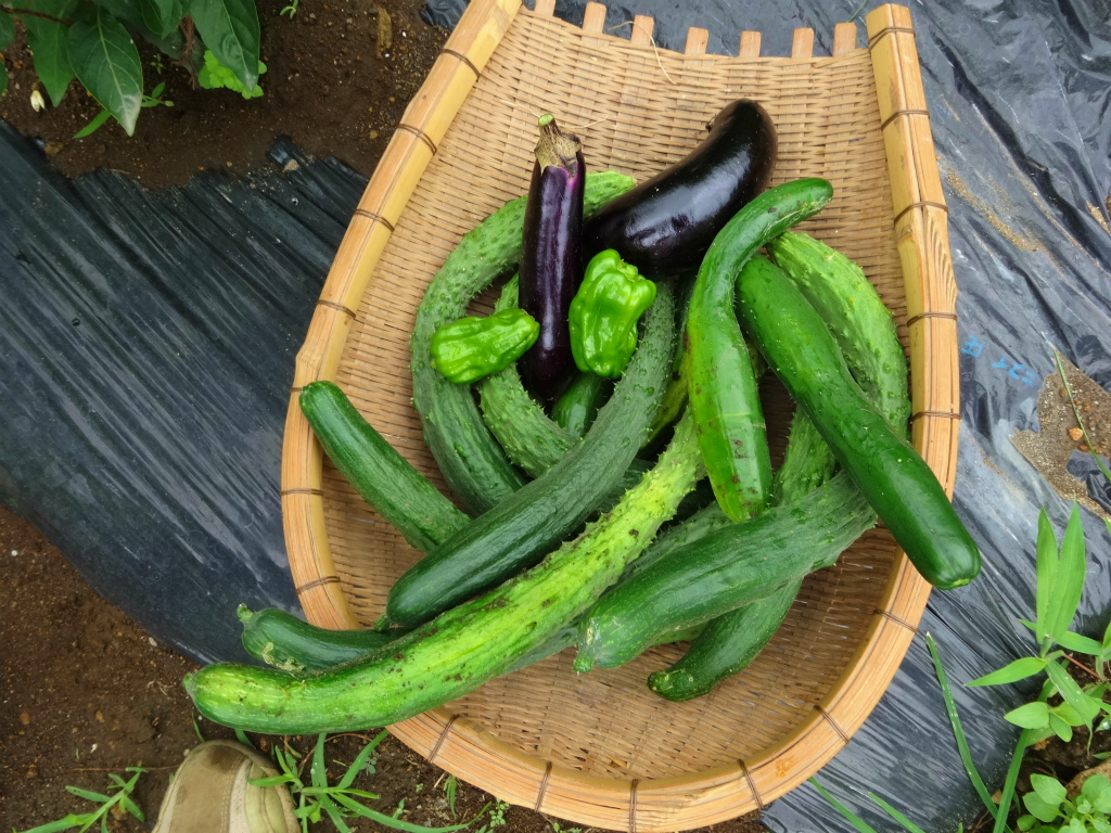我が家のニガウリやきゅうり、なす、ズッキーニ、とうもろこし、トマト、夏野菜が収穫の時期を迎えました。