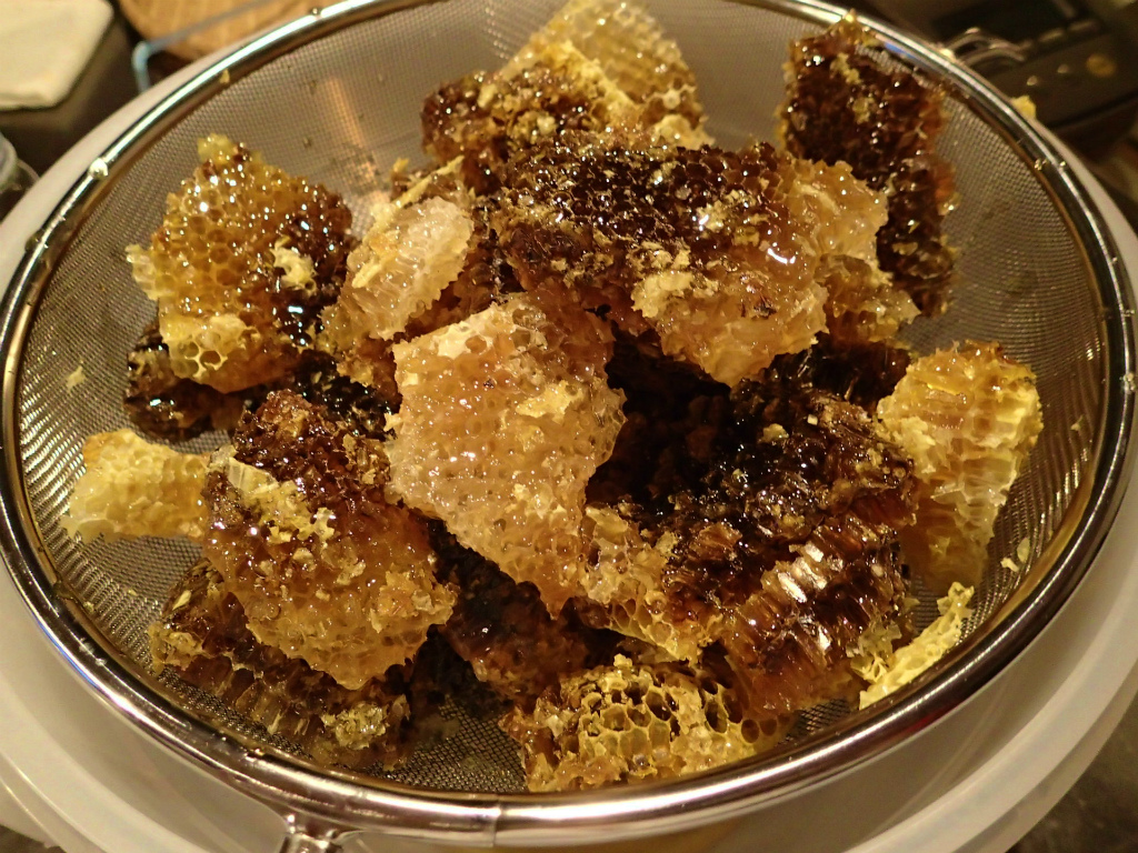 蜂にお返ししないなら蜜の残った滓をお団子にして冷凍庫に入れておくと、蜜のないときの蜂の餌、もしくは翌年の待ち箱の中に入れておく寄せ餌に出来ます。