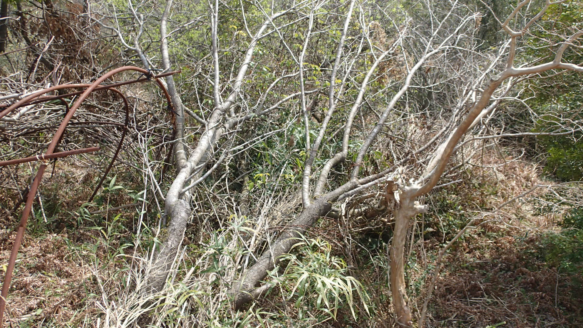 ただ置かせてもらうだけでは申し訳ないので、今日は圃場整備、畑(果樹園)入り口に昨年の台風で倒れて桜の木がそのままになっていたので、チェンソー持って片づけに行ってきました。