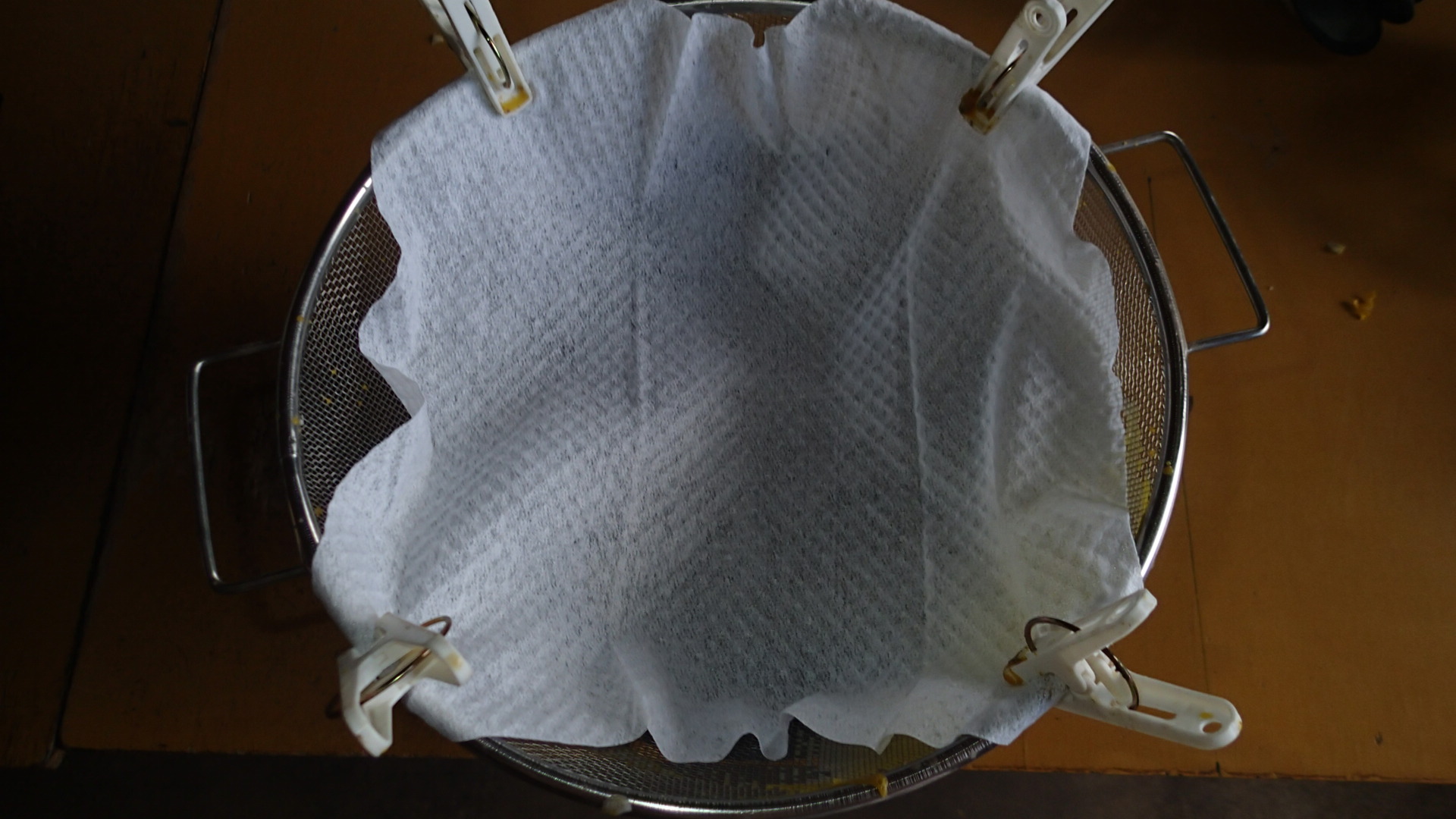 荒濾しは金網でしてあるので、それをもう一度溶かしてクッキングペーパーで濾して仕上げをしました。