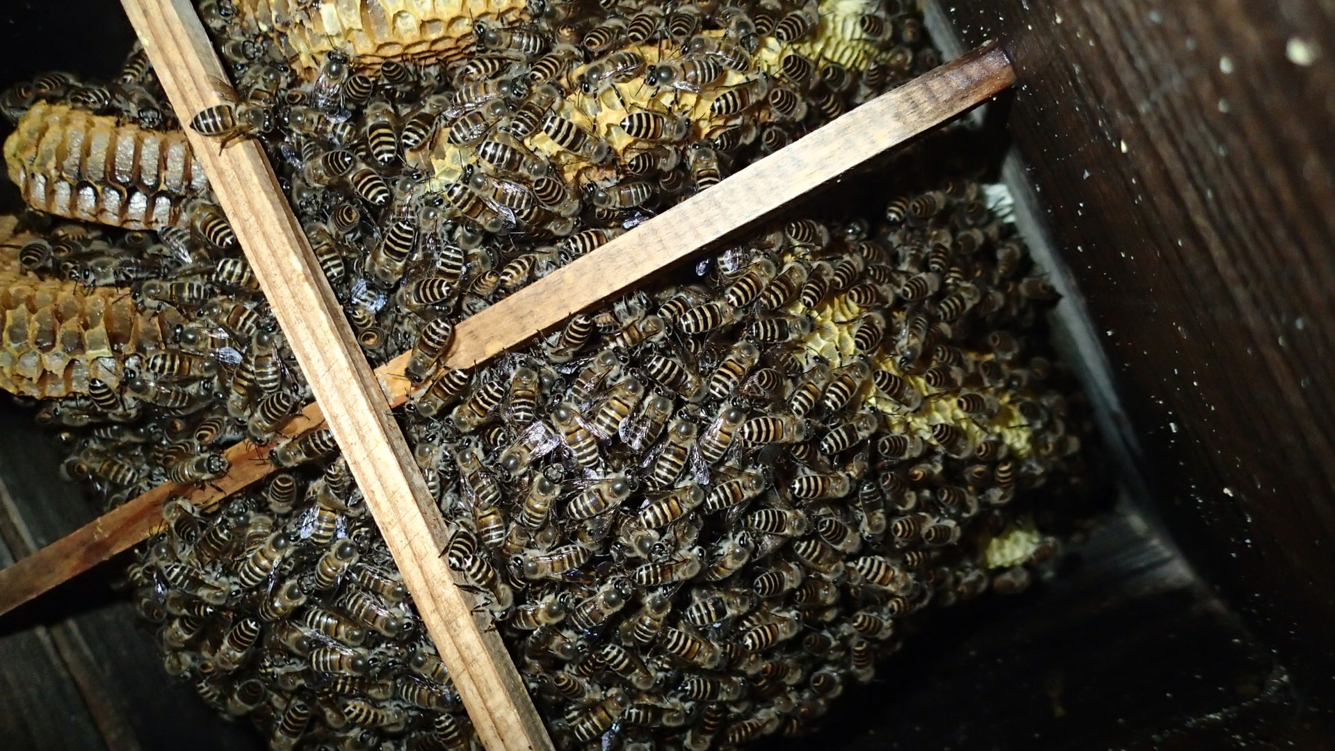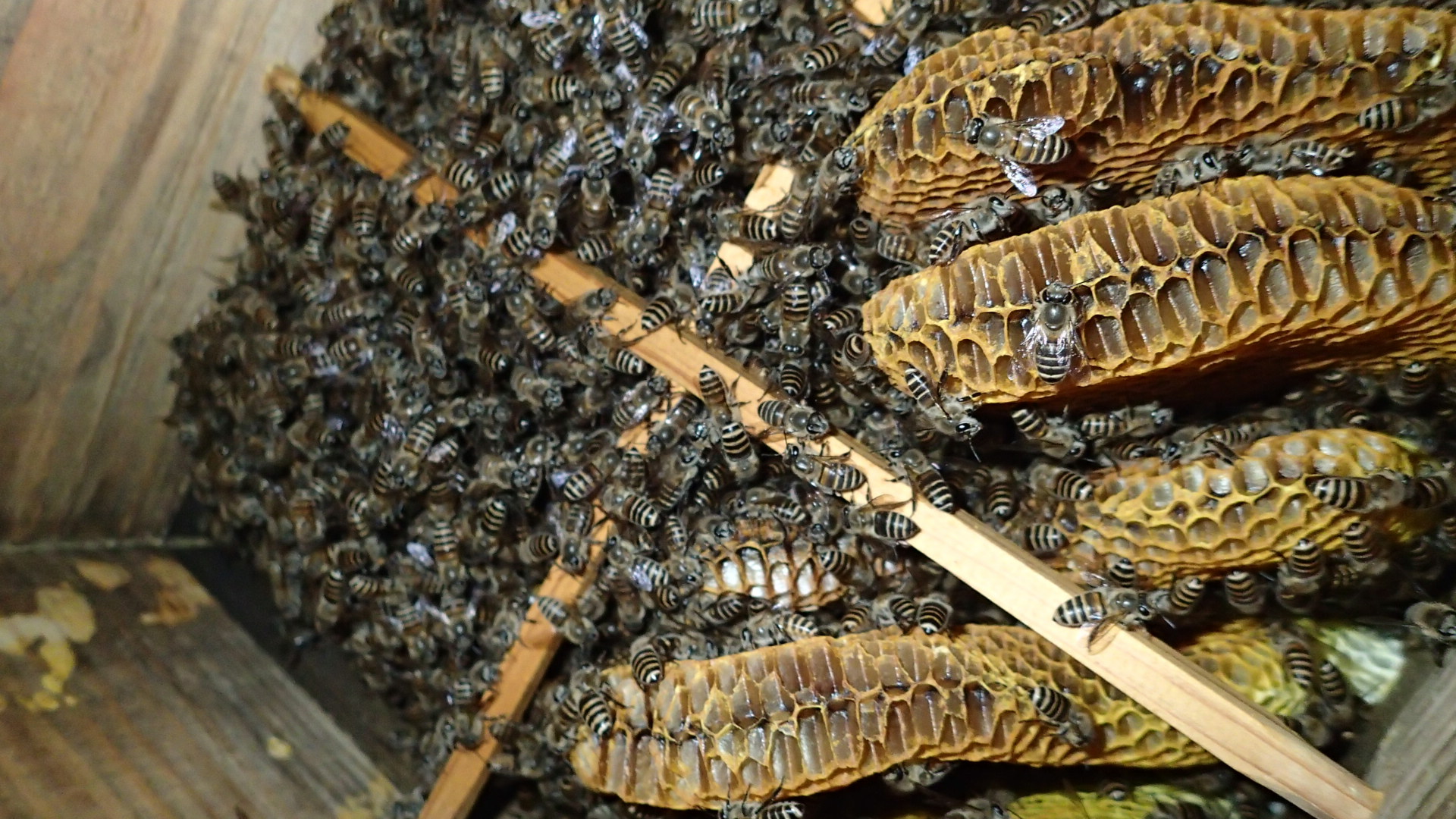 巣板が見えている巣箱があります。