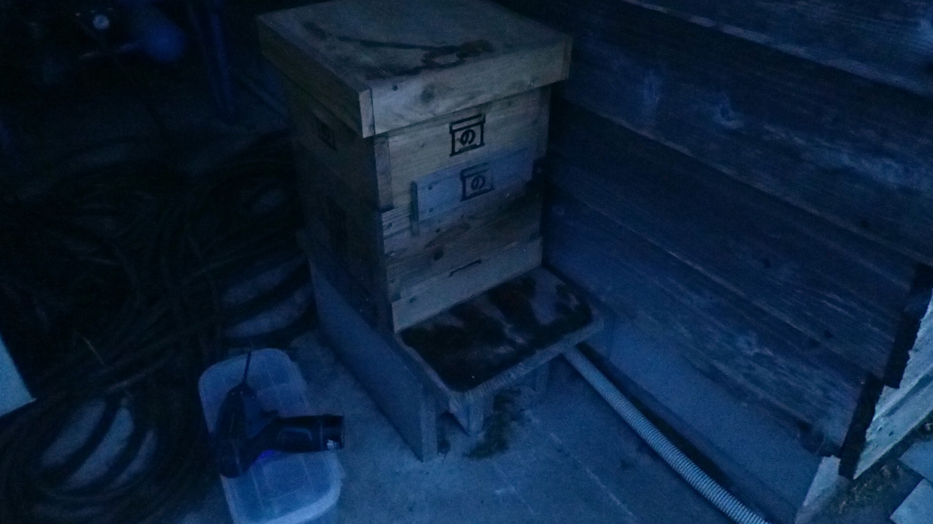 ハウス奥の小屋に設置した待ち箱入居群です。