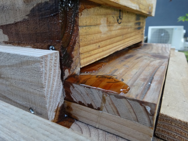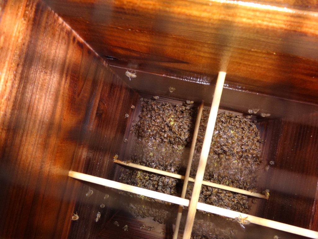 巣箱の水は蜜を濃縮して出てくる露のようです。蜜源がとても豊富な様子ウラヤマシイ。内壁にカビが生えたりして人間的には気になってしまいます。余分なことかもしれませんが、採蜜した際に天板の下にスノコをかませると上部から空気が抜けて結露は少なくなります。