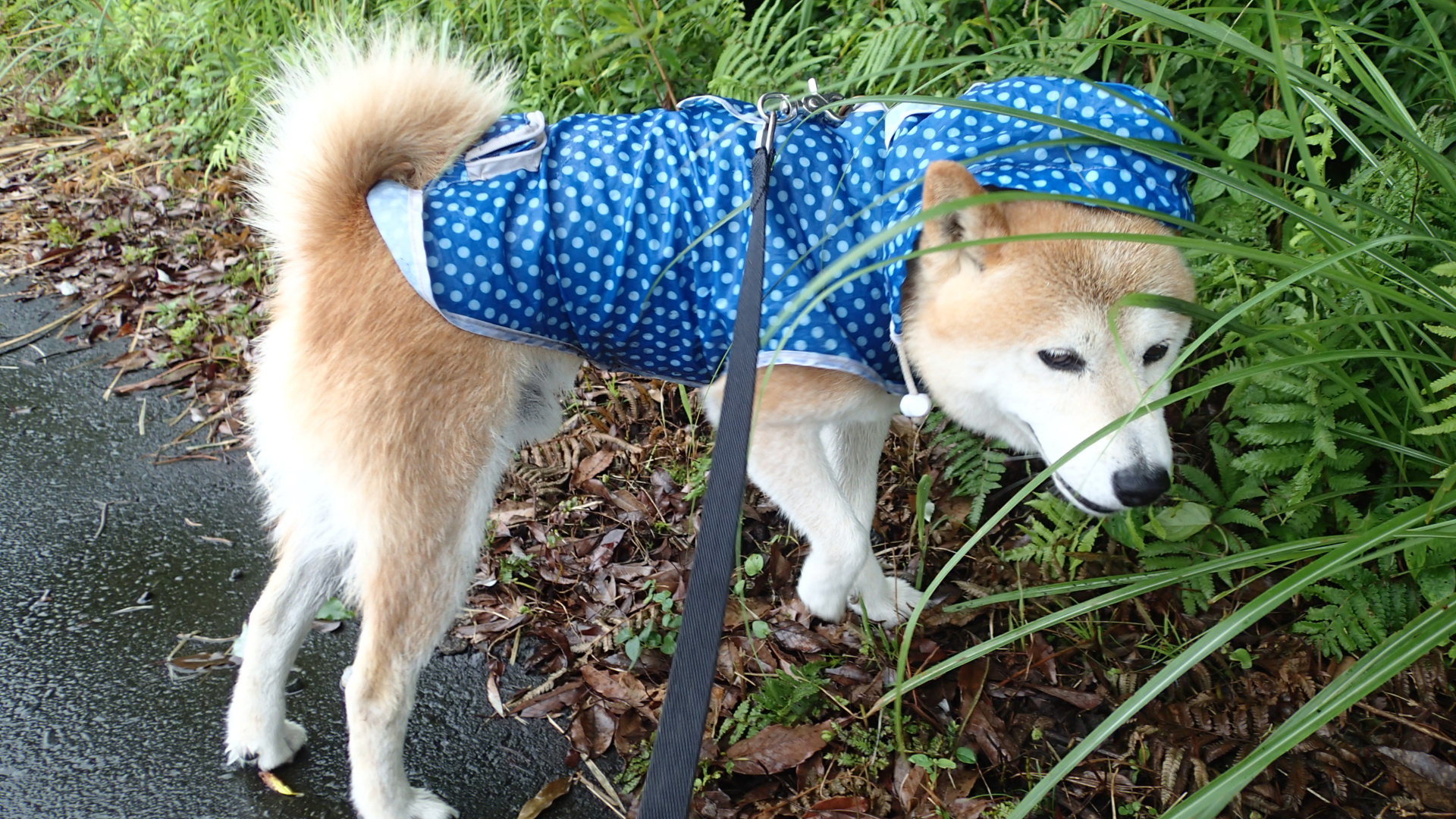 雨の散歩、昨日の写真、小さな合羽がフィットしてきました。