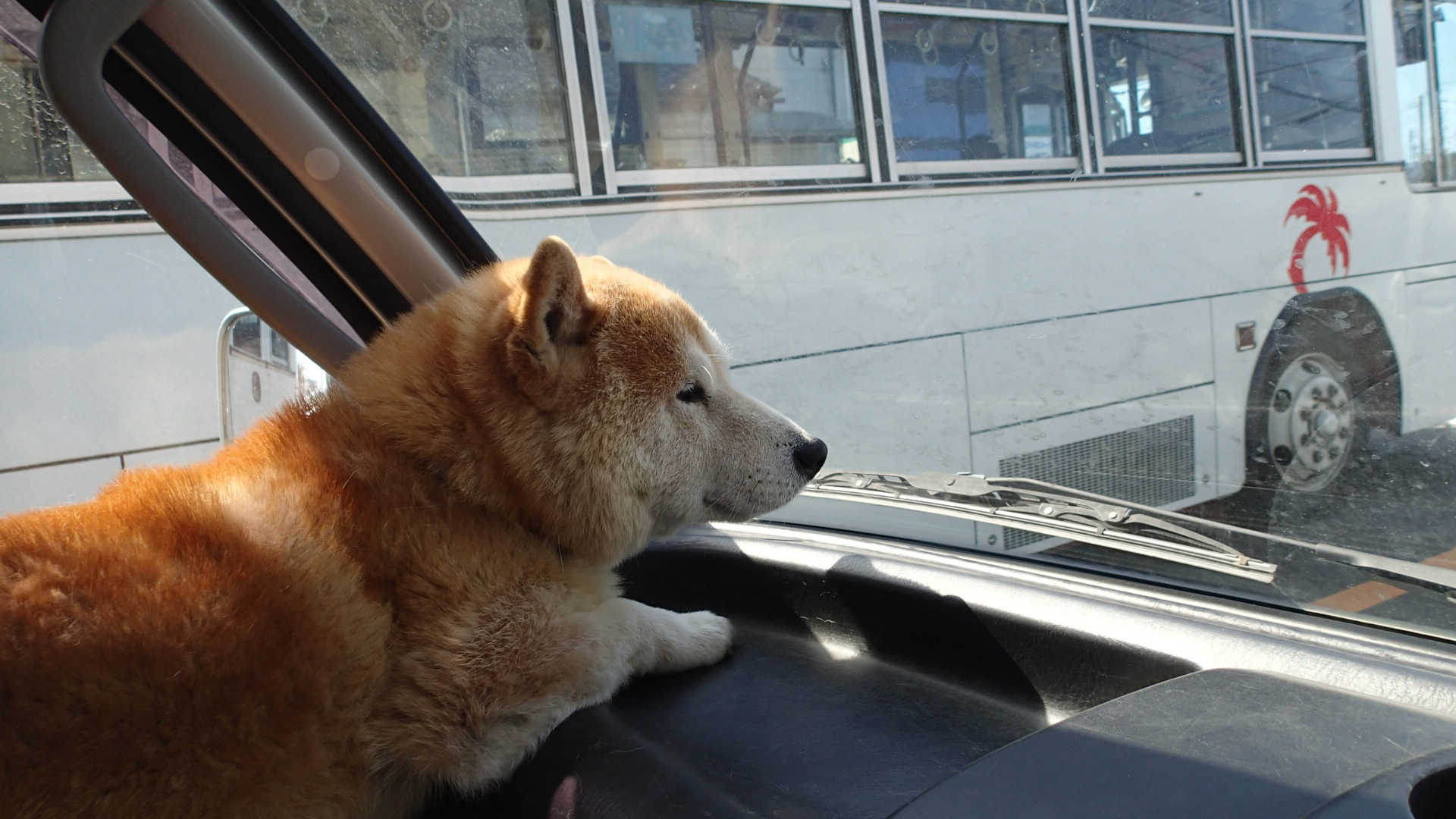 犬はドライブが好きですが町中のドライブはちょっと警戒します。大きな車が走っているし、いつもの野性的な匂いがしないからです。