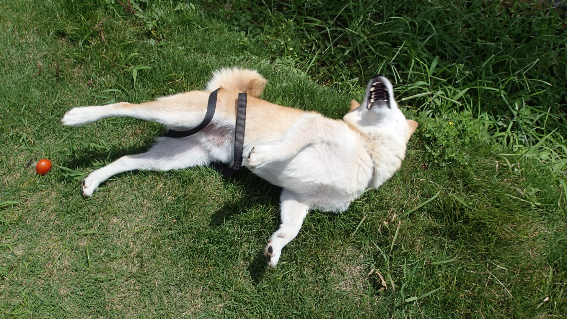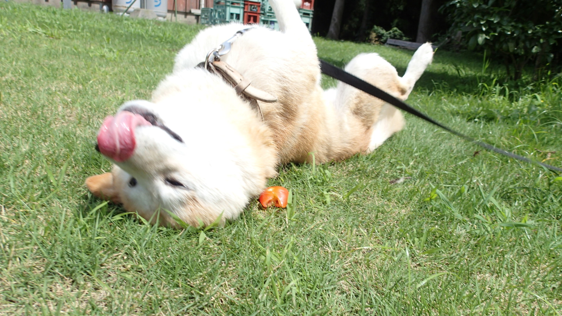 犬は食べるよりスリスリしました。トマトと草にスリスリです。