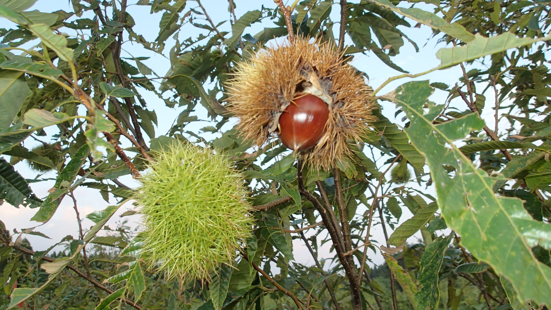 果樹園に植えた、まだ年数の浅い栗の木には少し実がついていますが、