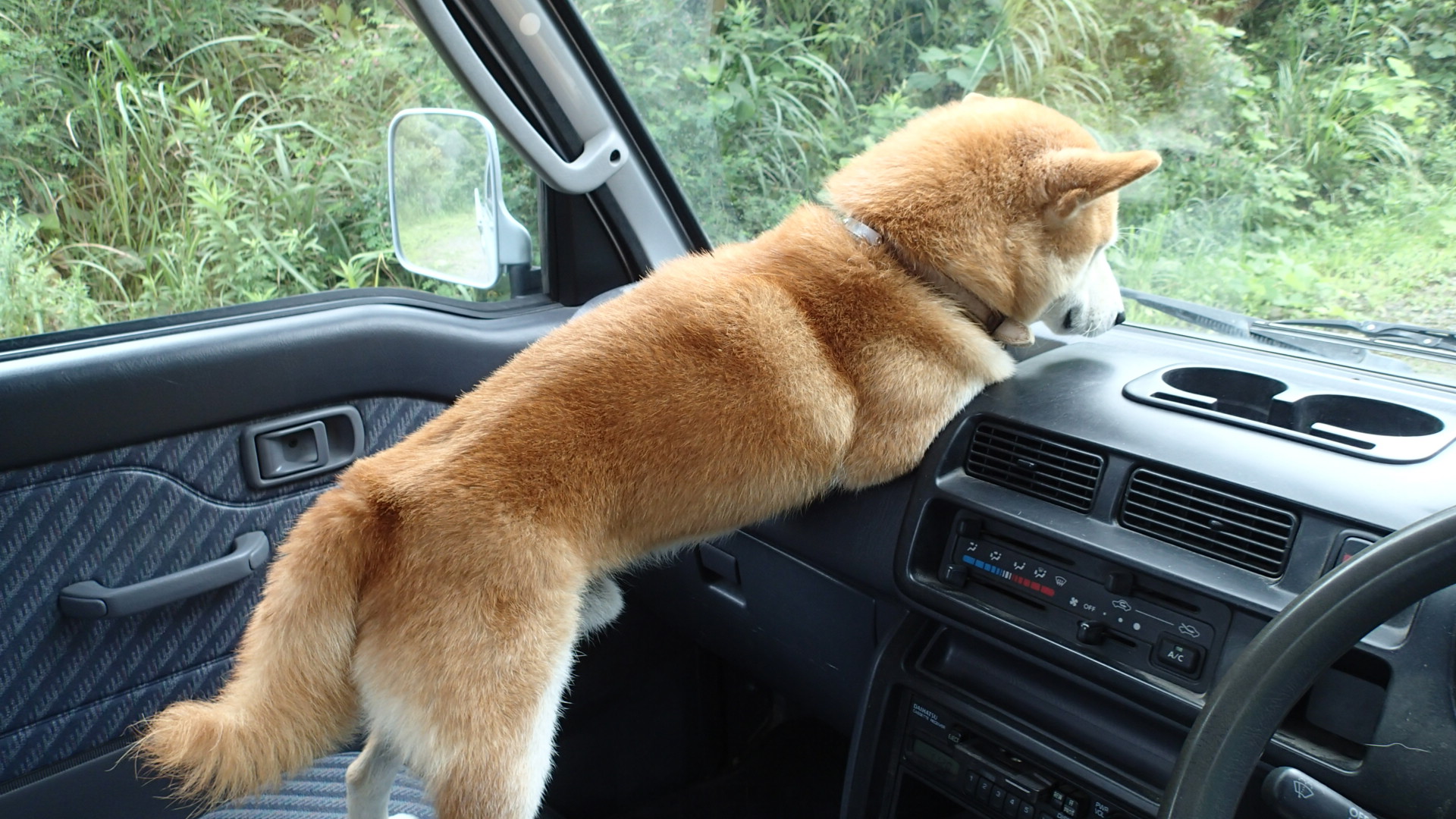 そんなわけで蜂箱点検に犬も同乗ドライブしました。