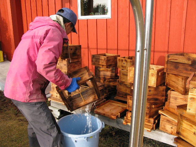蜂箱をバーナーで焼くと手が汚れます。一年屋外に置いておくのがよいのでしょうが、そんな時間はぼくにはありません。今日は結構な雨がふりましたが、冬は雨が少なく雨ざらしにはなかなかならないのが通常です。ですのでどなたかのブログに雨を溜めて水洗いしたという記事を参考にぼくもポリバケツに雨水を溜めてじゃぶじゃぶ洗いました。 こんなこと蜂飼いになるためなら労を惜しみません。