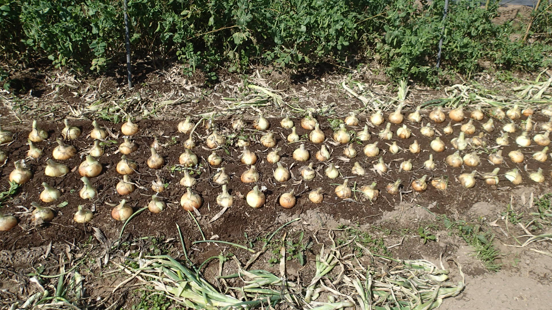 玉ねぎ収穫しました。このあと根っこを結んで下げました。