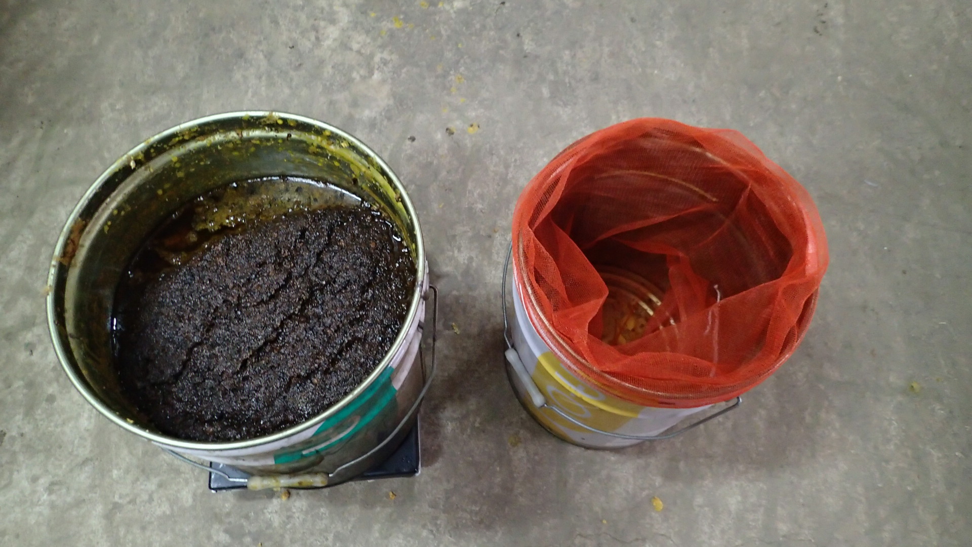しかたないので、別のペール缶に網を準備してそれに流し込みました。