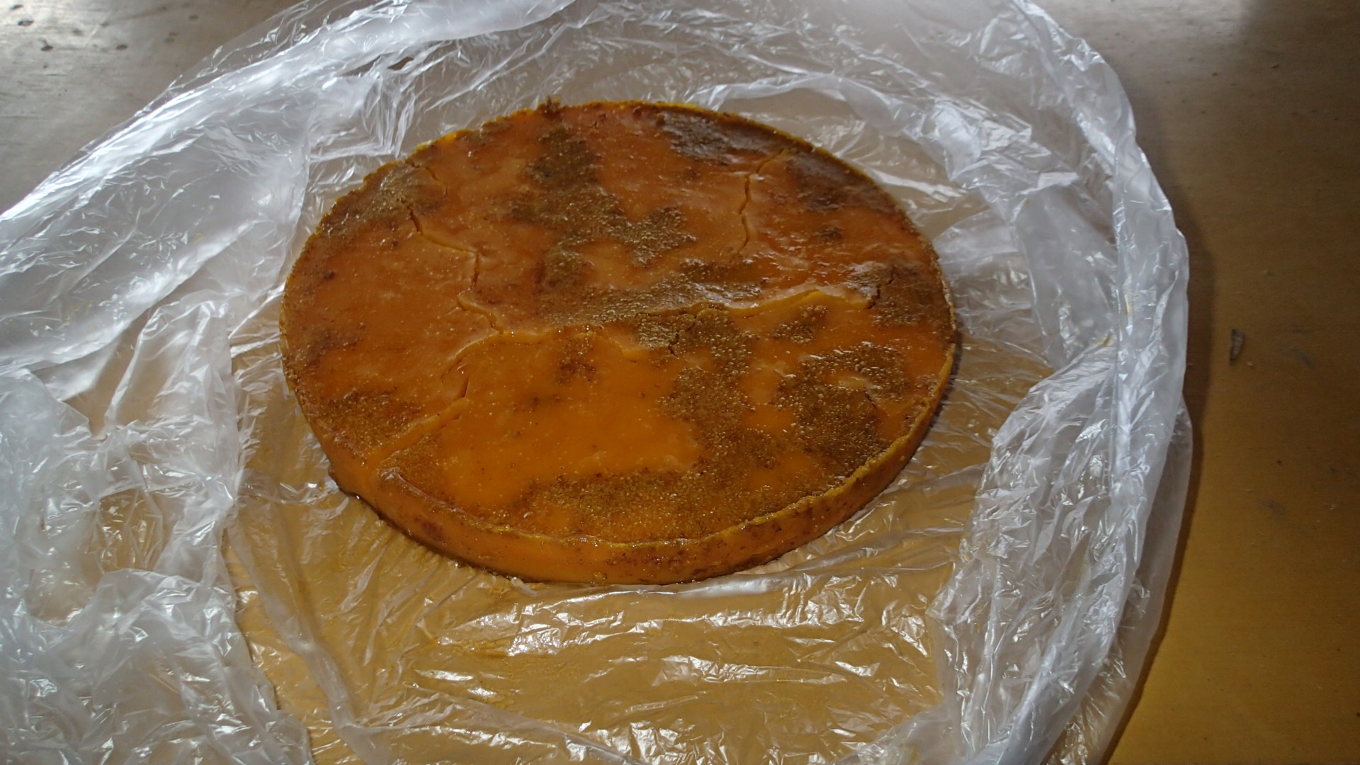 出来上がりの蜜蝋は1キロと300グラムぐらい、もう一回蜜蝋のかすを精製するので、もう少し増えるかも・・・・。