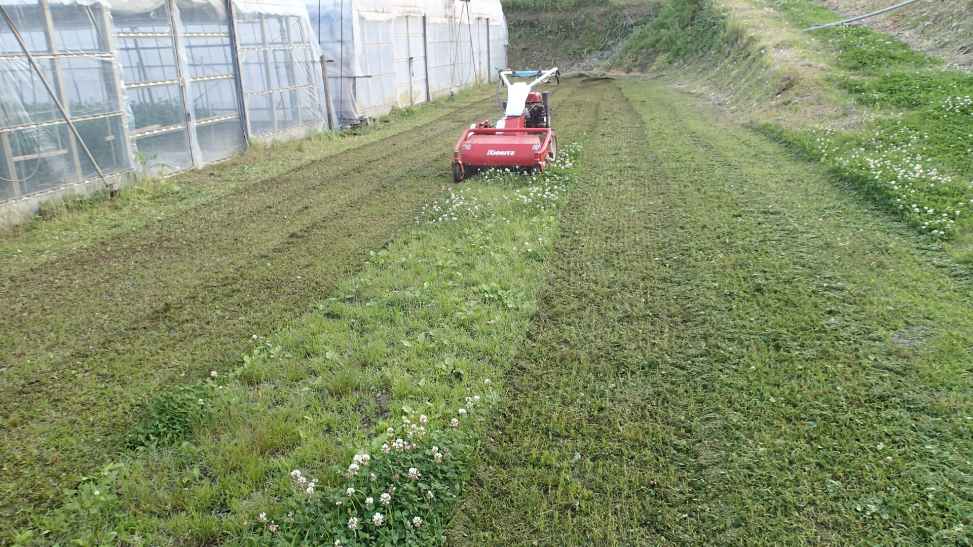 ハウスまわりにハンマーモアーをかける、