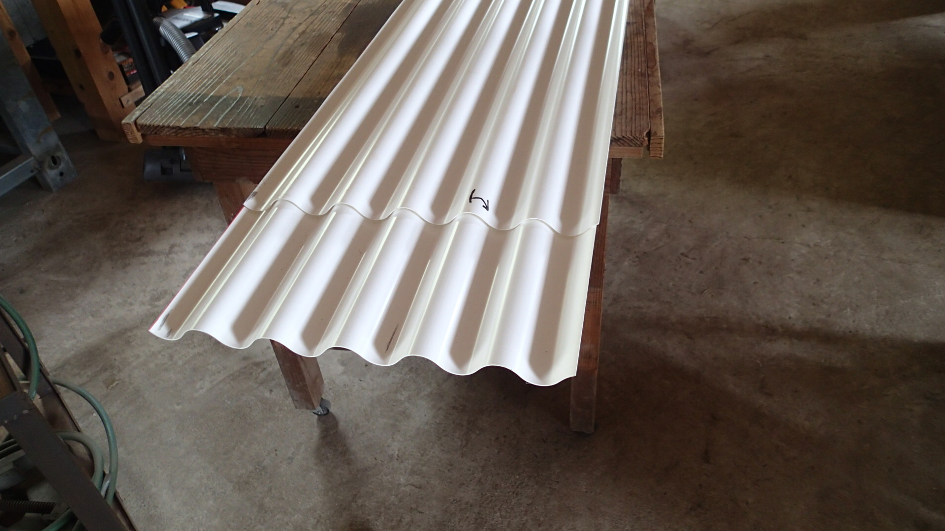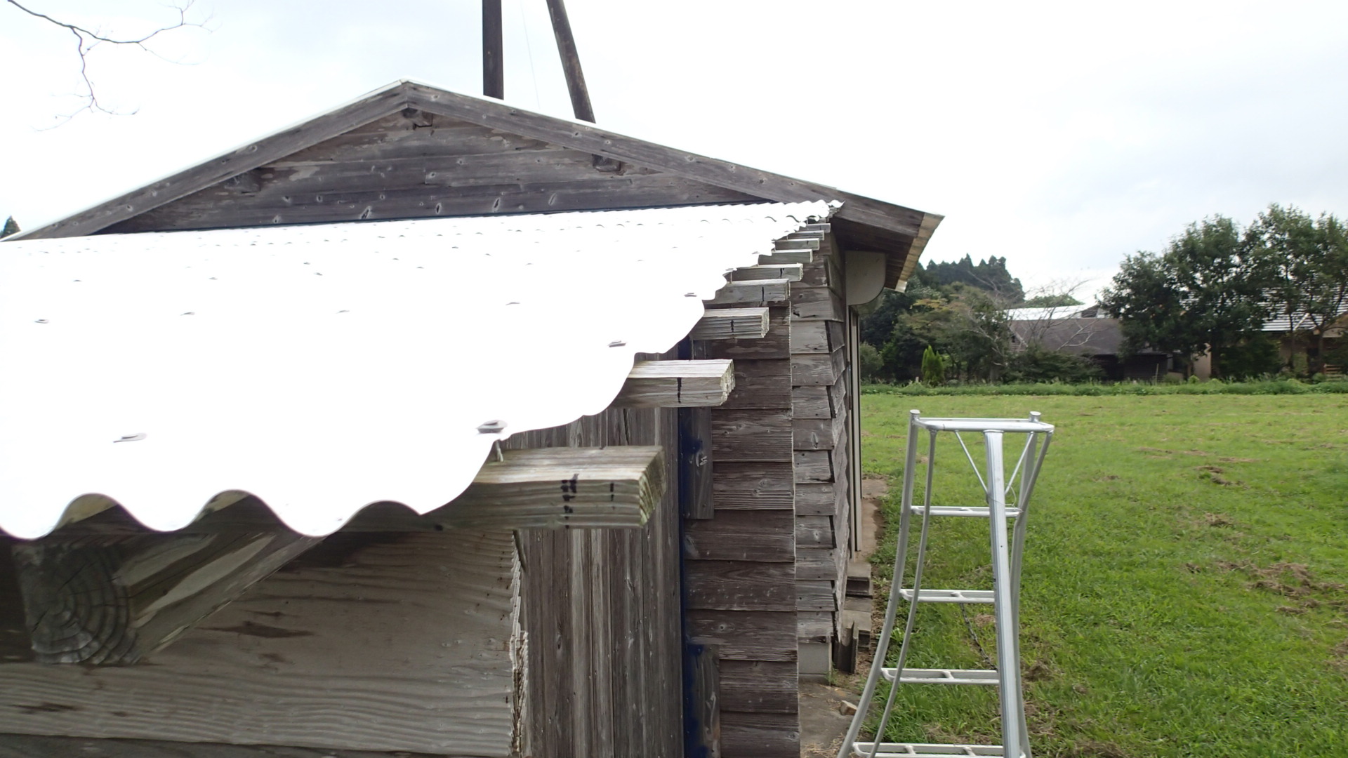 そんなわけで朝からはまって(気合を入れて)トラクター小屋の畜波板の修理にとりかかって、垂木とハブ板を用意して、畜波を今回は半分にして使うため切ったりしていたら、