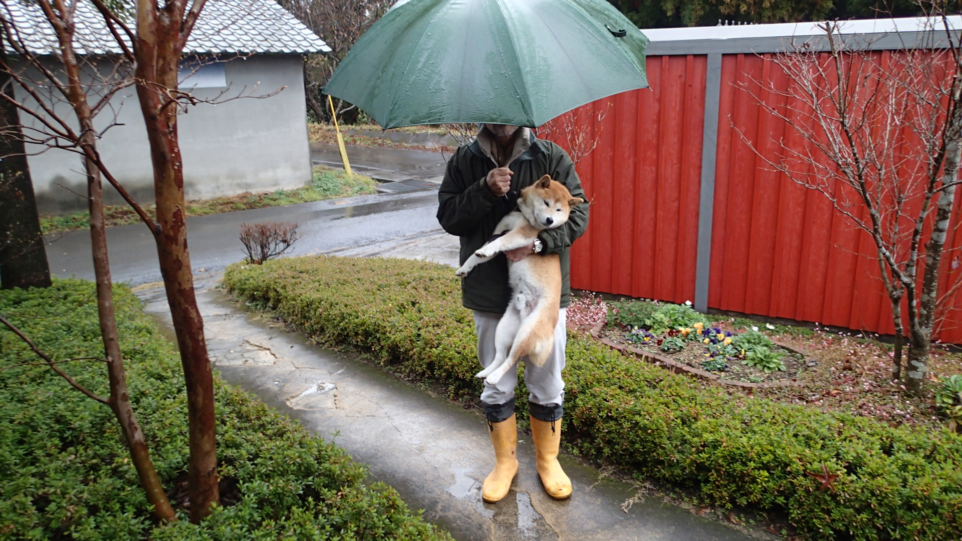 雨の散歩の後は、臭い、臭いって言いながらおじさんが体を拭いてくれます。