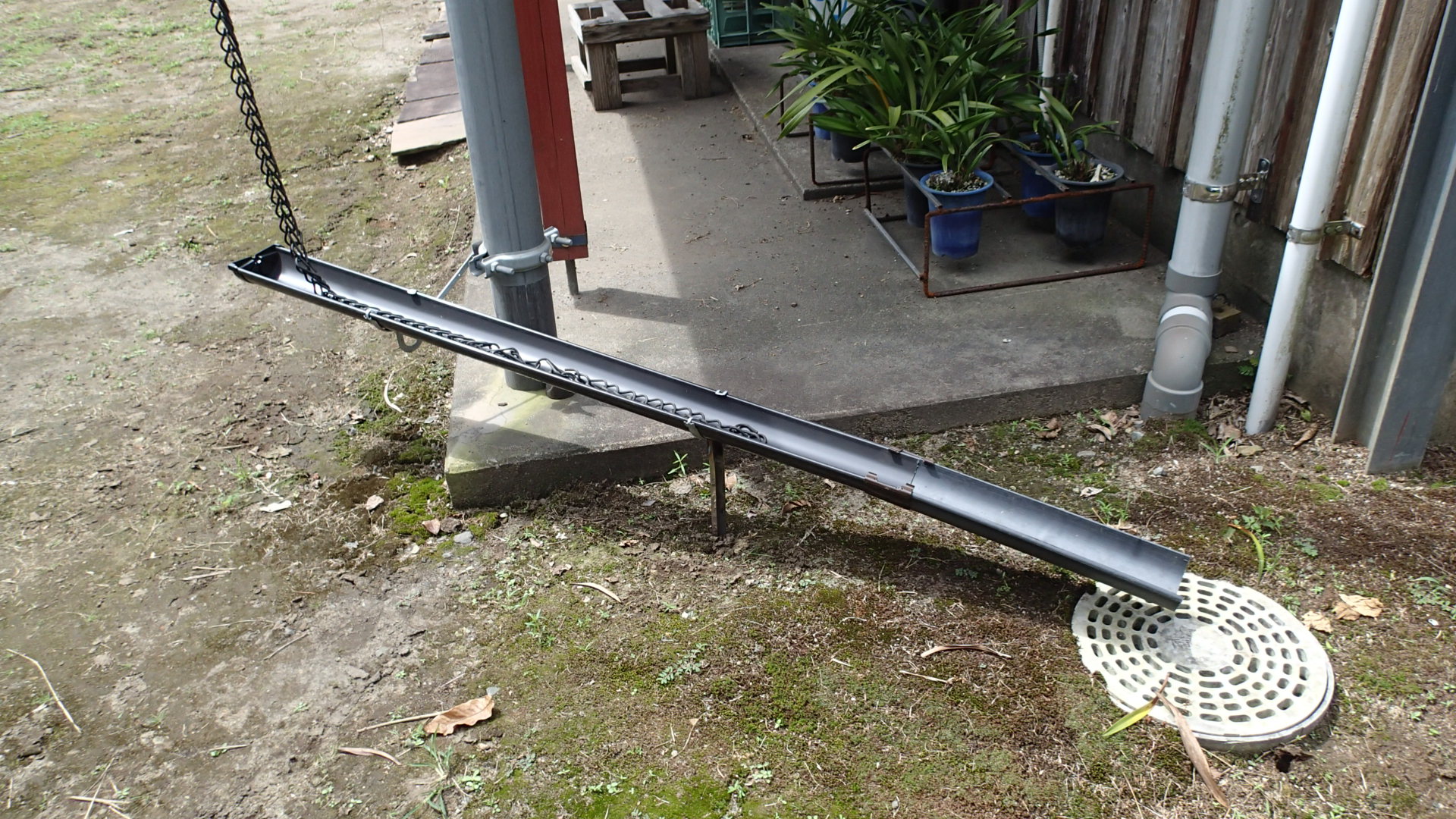 チェーンで雨が直接地面に落ちるのを緩和するとこまでは出来ていたんですが、