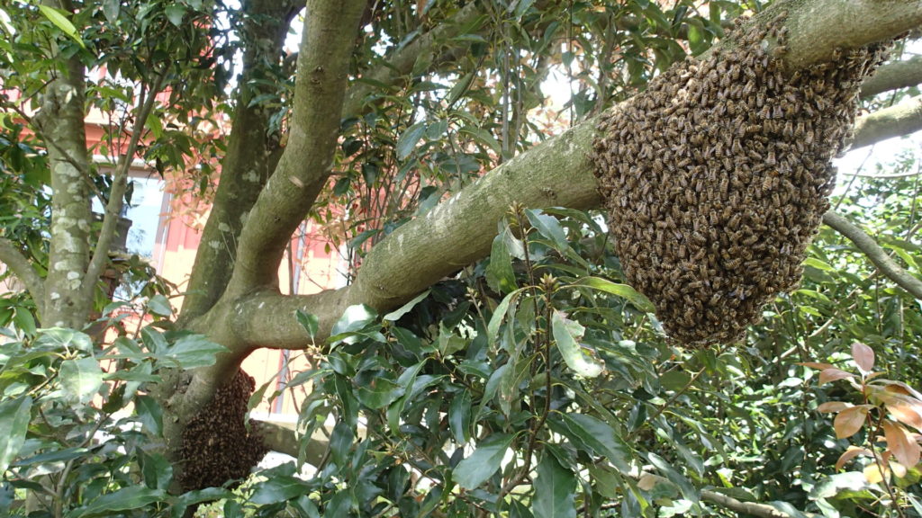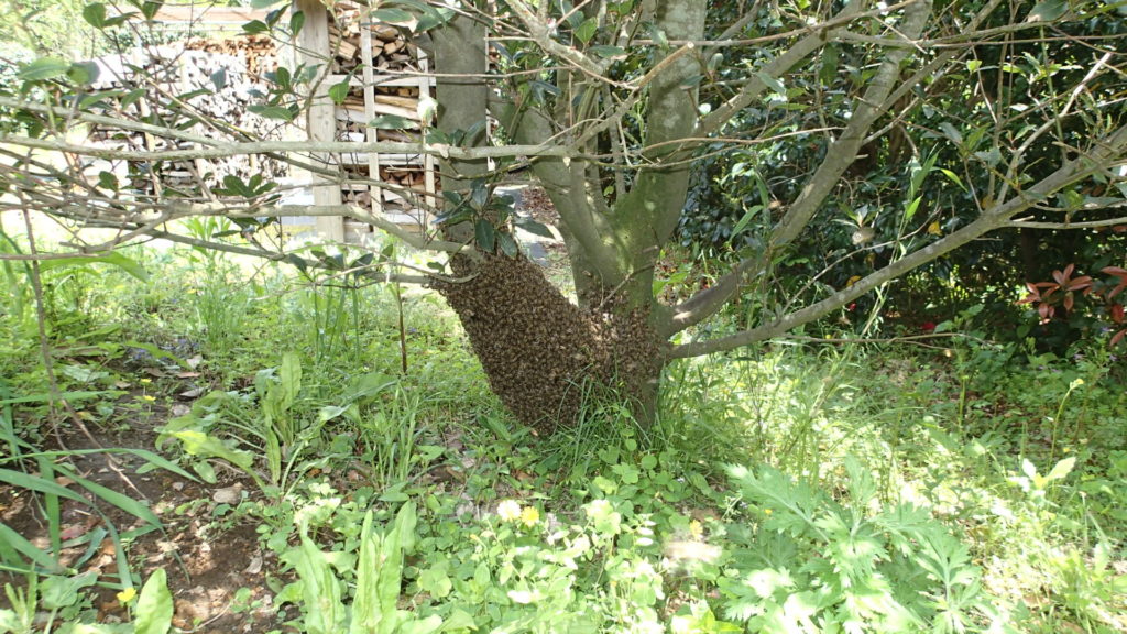 今日の分蜂、昼過ぎ蜂球が低いところに出来ました。