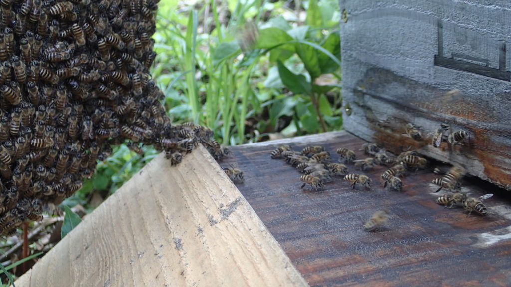 蜂球からみつばちが歩いての入居ショーが見れる、めったにないことです(ぼくは初めてです)。