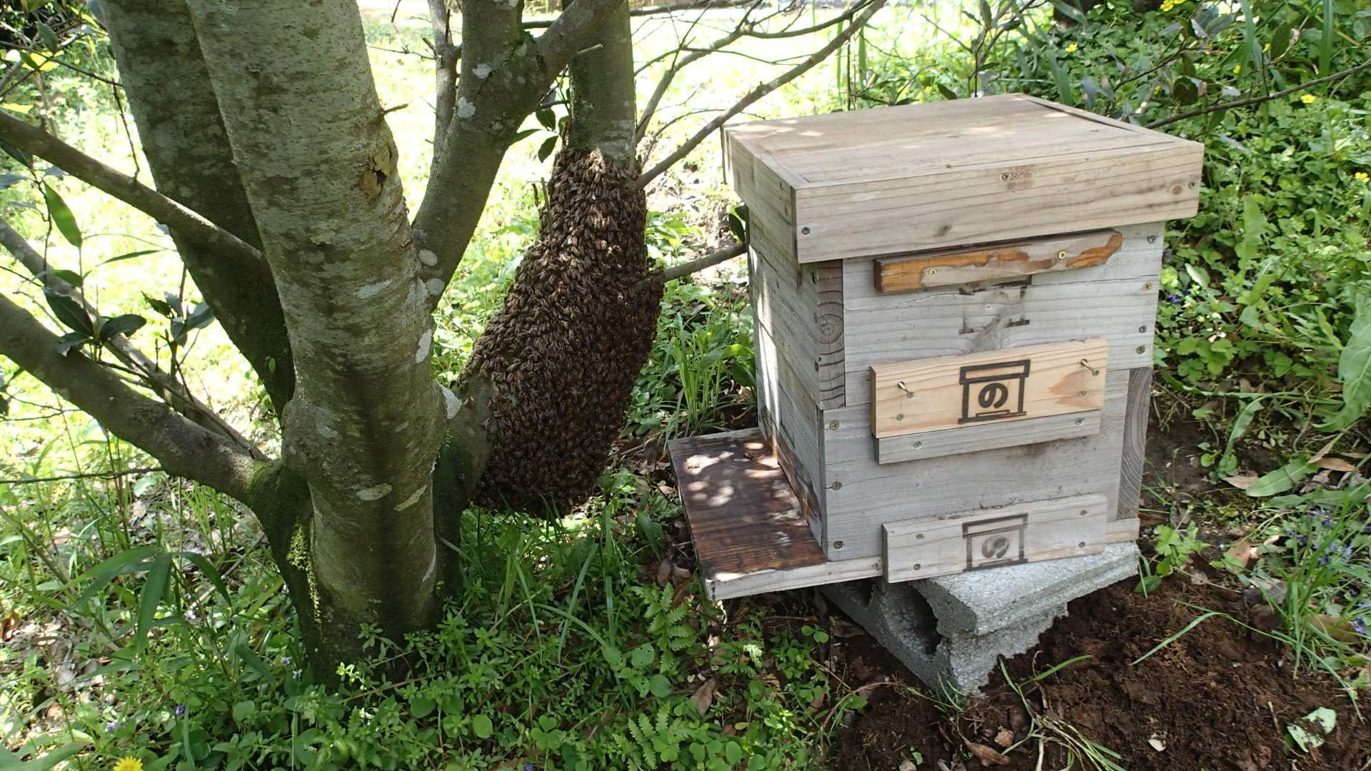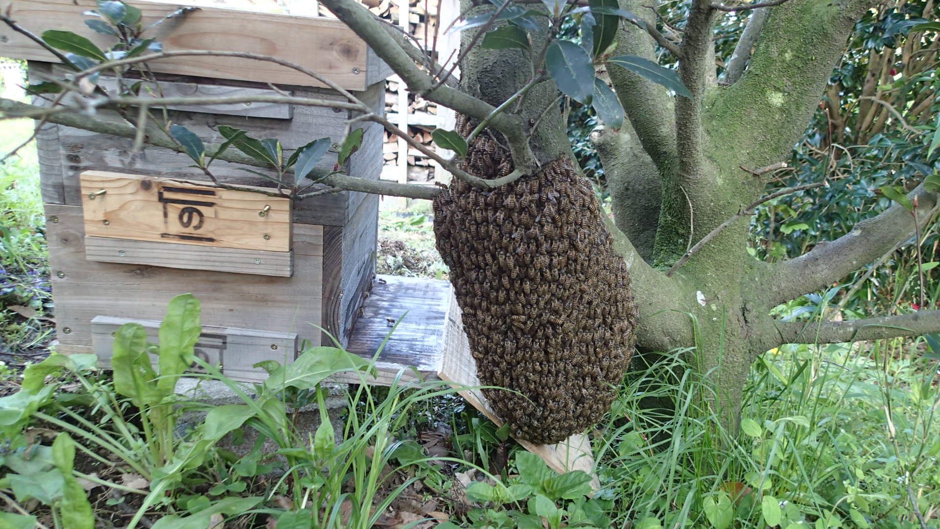 今日の分蜂、昼過ぎ蜂球が低いところに出来ました。