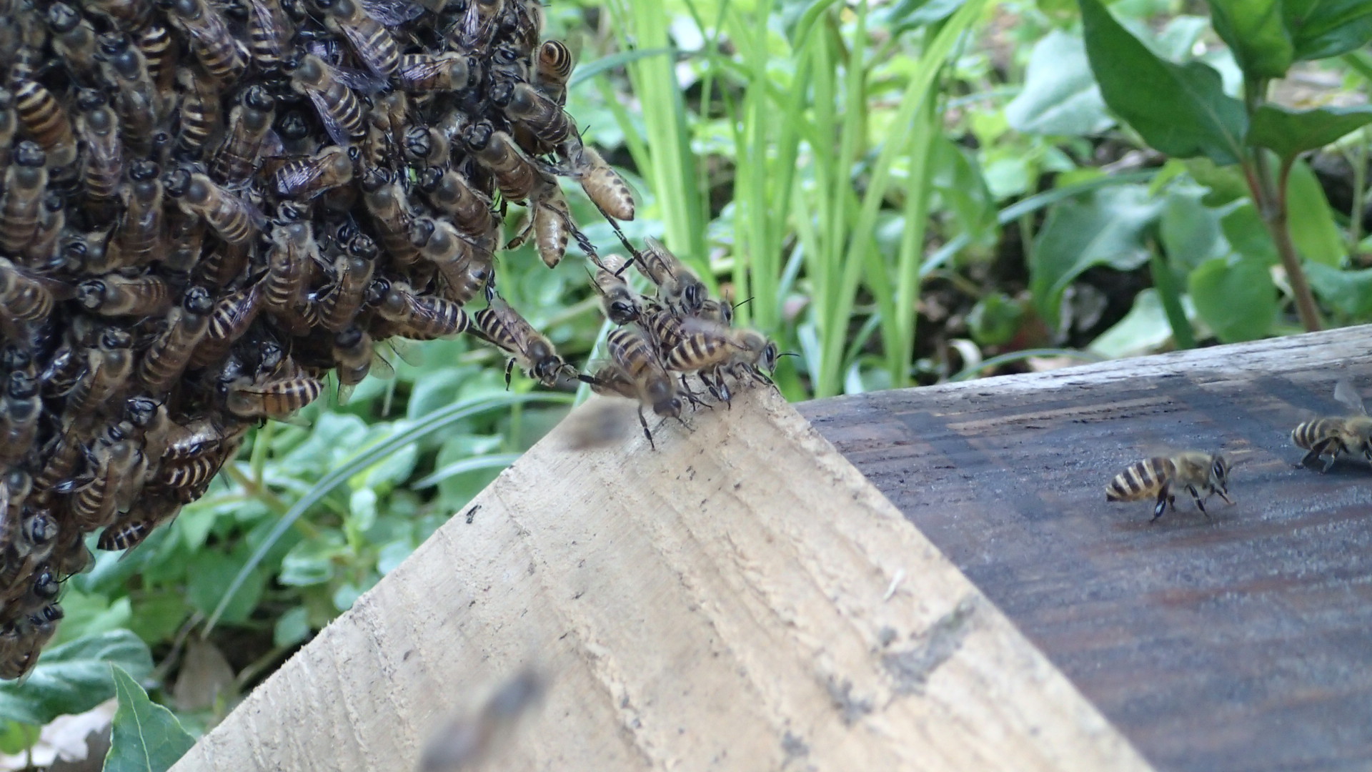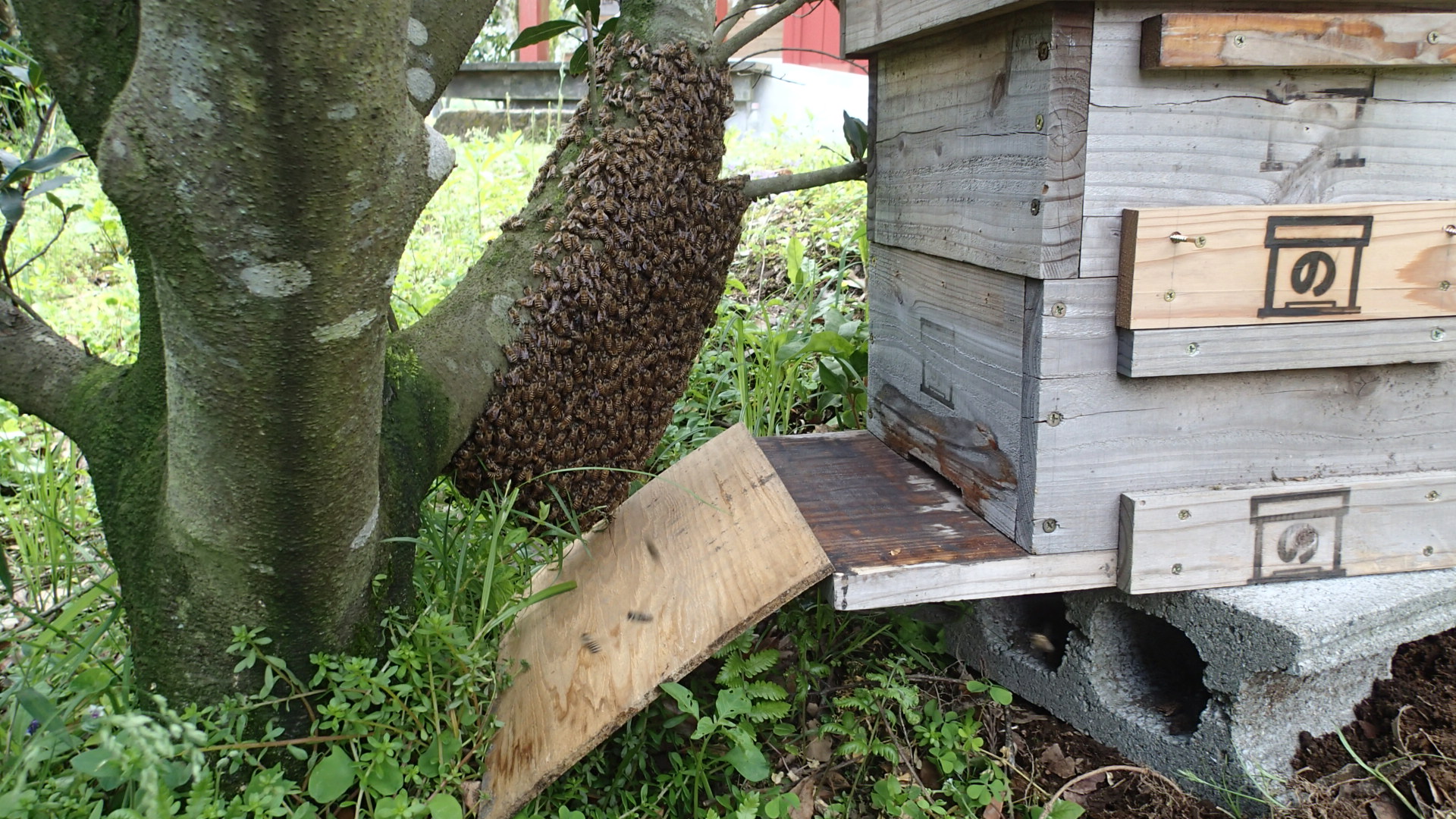 そしてどこかに蜂球を作る。その蜂球がばらけて巣門からみつばちが入居する場面、